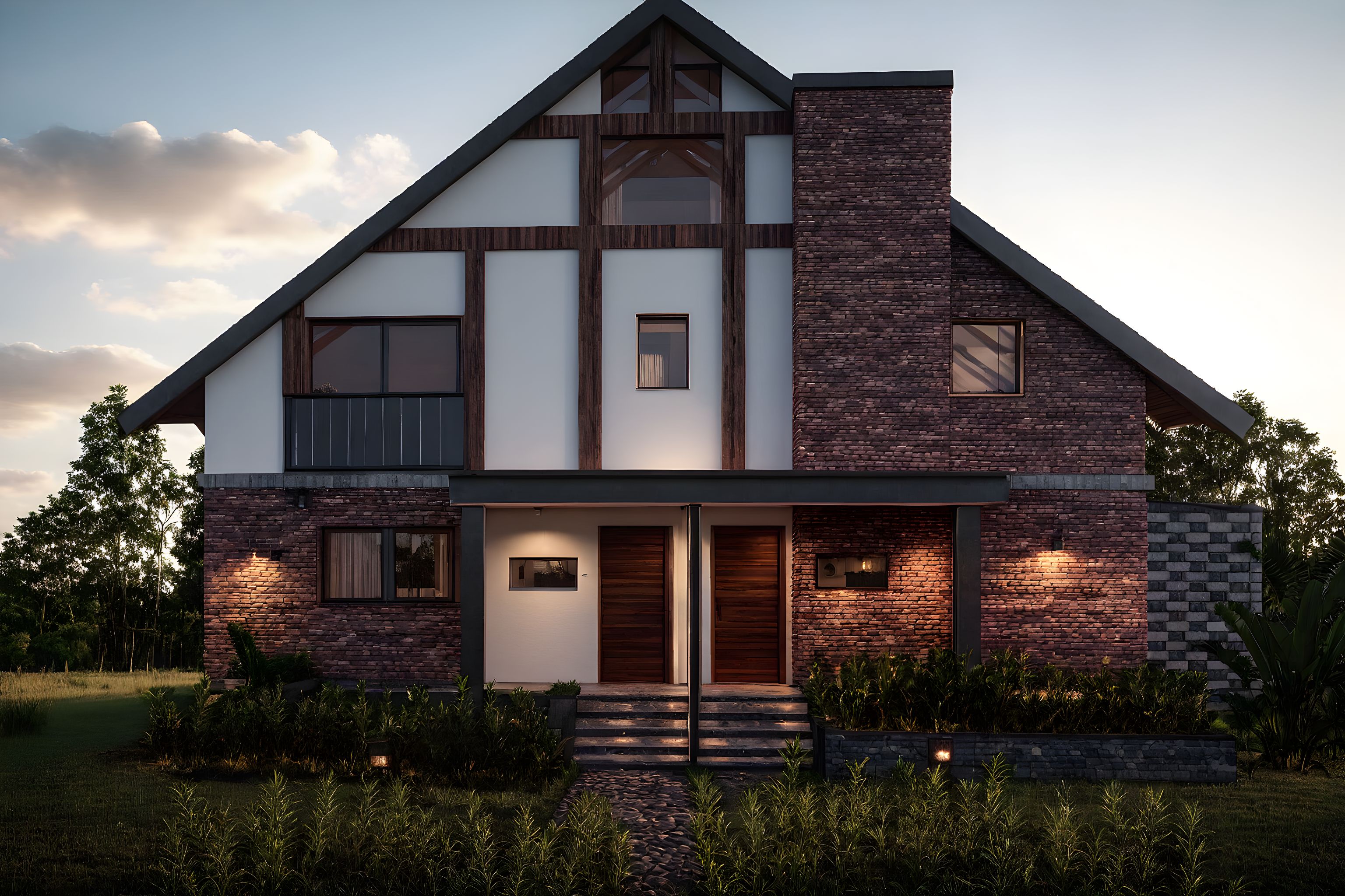 PromptGerman-style countryside house facade made of bricks in reddish tones, dark wood, metal, and stones in some areas. The house is in the middle of a field in Paraguay.