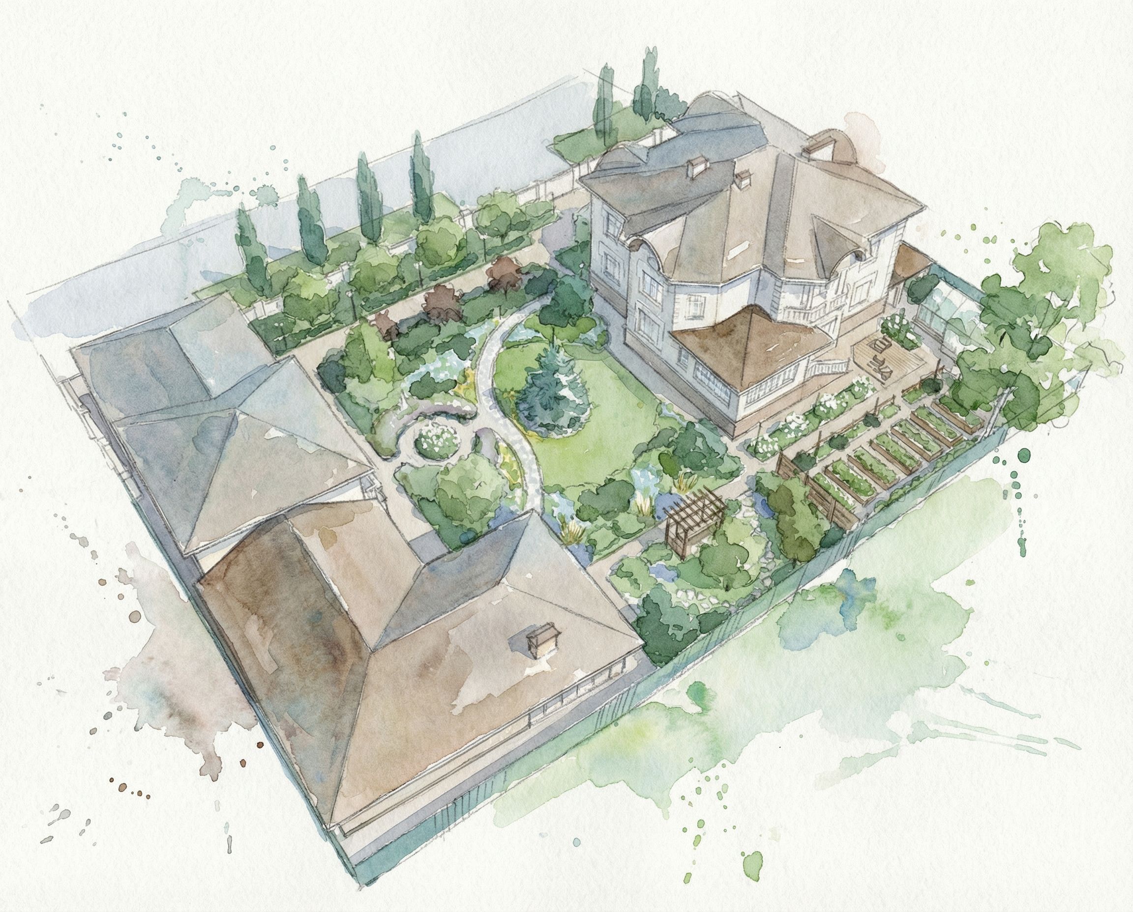 PromptConvert this landscape photo into a loose watercolor sketch. Light pencil underdrawing visible beneath translucent watercolor washes, wet-on-wet technique with colors bleeding softly into each other, white paper left unpainted for highlights, loose splashes and drips at edges, limited palette of greens, blues, earth tones. Quick, fresh, spontaneous feel. Landscape architecture presentation watercolor style. Maintain all elements and viewpoint., keep exact camera angle
