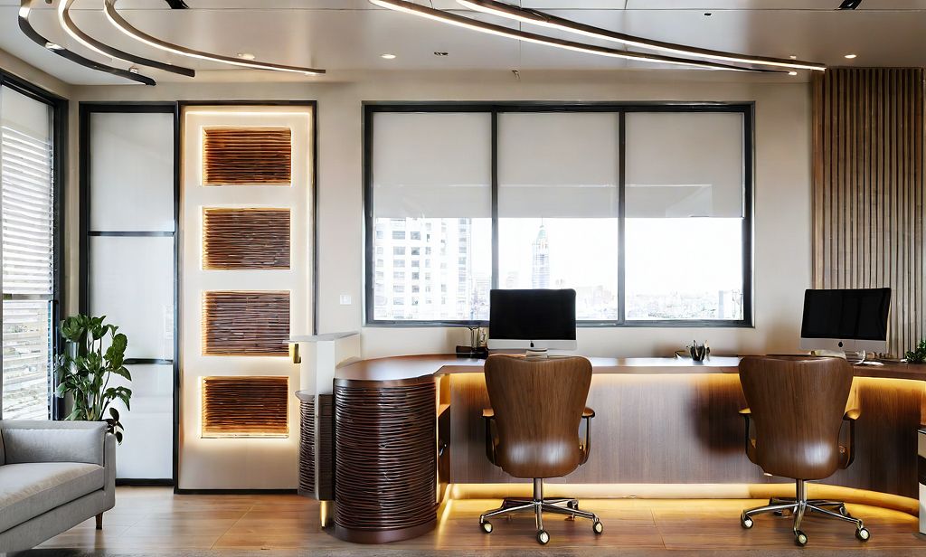 PromptPhoto of a modern office reception area featuring a sleek, curved reception desk with a glossy finish. Emphasize large windows that allow natural light, creating soft shadows on light wood flooring. Highlight intricate ceiling details with elegant lighting fixtures that add a contemporary touch. The inviting space is framed by minimalist furniture and a decorative plant, contributing to a professional atmosphere. Captured from an eye-level perspective with a slightly wide lens to encompass the room's layout and design elements.