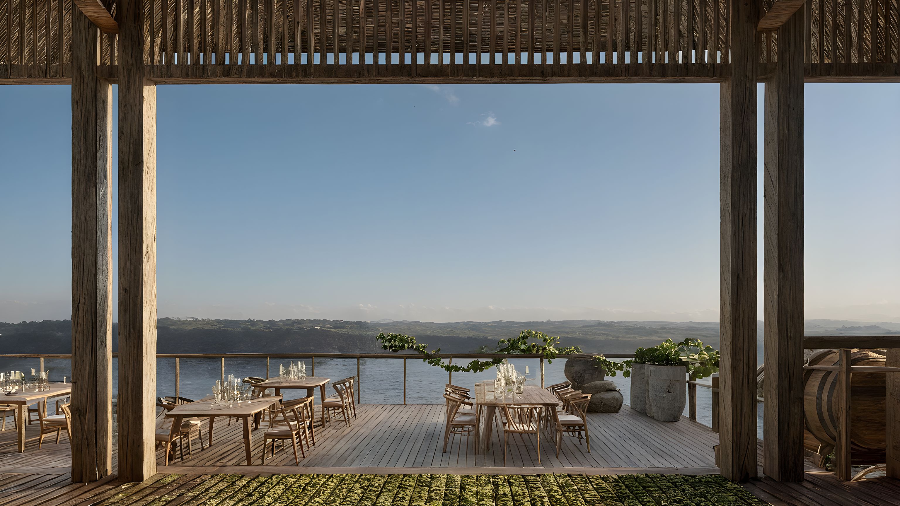 Promptthis is a winery, add vineyards and vegetation in the background to so that it looks contextual. Do not alter any materials of the architecture, leave that as is. Just add vines. The roof should be brown Mangalore tiles, walls can be slightly rough lime plaster of cream color. the structural members are of wood and the plinth of basalt. ADD VINE PLANTS IN THE BACKGROUND. add some creepers along the railing
