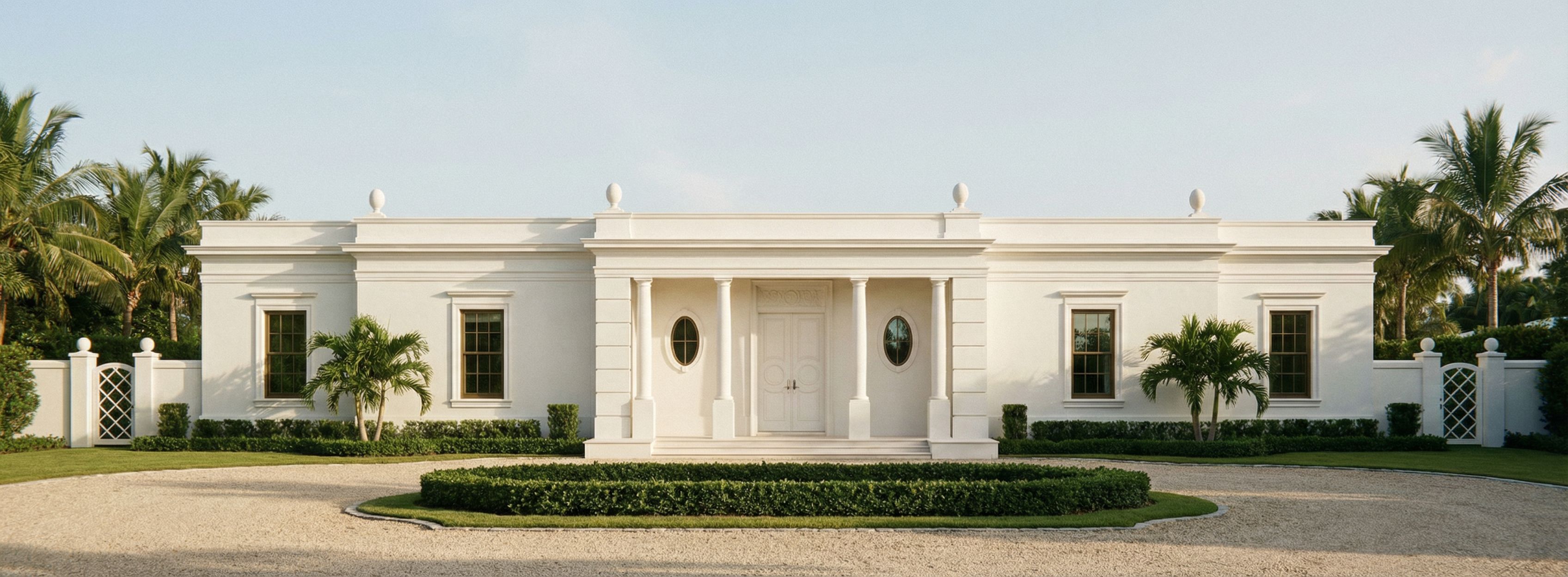 Ultra-photorealistic rendering of a Neo-Classical Regency Palm Beach residence using the provided elevation as a fixed, non-editable architectural blueprint. CRITICAL — ABSOLUTE CONSTRAINTS: Do not add, remove, or reinterpret any architectural elements. Do not add an additional entablature, parapet height, attic story, or upper level. The building is strictly one story with a single continuous entablature line across the entire façade. Do not thicken, stack, or duplicate the entablature. Do not raise the central mass above the rest of the building beyond what is shown in the elevation. MASSING MUST MATCH EXACTLY: The façade must clearly read as three stepped depth planes: Central entry pavilion projects forward Flanking wings are recessed End wings are recessed further Do not align into one flat plane and do not compress or exaggerate these offsets. Preserve all proportions, symmetry, window and door placement, column spacing, and horizontal datum lines exactly. Single-story Neo-Classical Regency composition with a projecting central entry pavilion. Classical columns support a single entablature. Oval finials on roof in essential points that are in proportions with the rest of the house. DOOR + TRANSOM VERY IMPORTANT: Above the double front door is a transom panel within the door opening, not part of the roof or parapet. This panel is solid no glass and contains refined Regency plaster relief low relief, elegant, symmetrical. Materials: all-white palette. smooth stucco, slightly brighter white trim, crisp classical detailing. Thin mullions, soft reflective glass, minimal bronze accents. Palm Beach landscape: symmetrical, restrained, luxurious. Curved motor court Lighting: soft warm sunlight illuminating the front façade directly. Gentle shadows that reveal the step-backs and column depth. slight humidity and Florida haze. Camera: perspective front view, eye-level, 35mm lens. Ensure visible depth between the three façade planes. Highly realistic materials, subtle imperfections, soft reflections. NEGATIVE CONSTRAINTS: no second story, no attic, no added parapet height, no stacked entablature, no roof ornament, no misplaced relief, no modern reinterpretation, no altered proportions, no flattened façade, keep exact camera angle