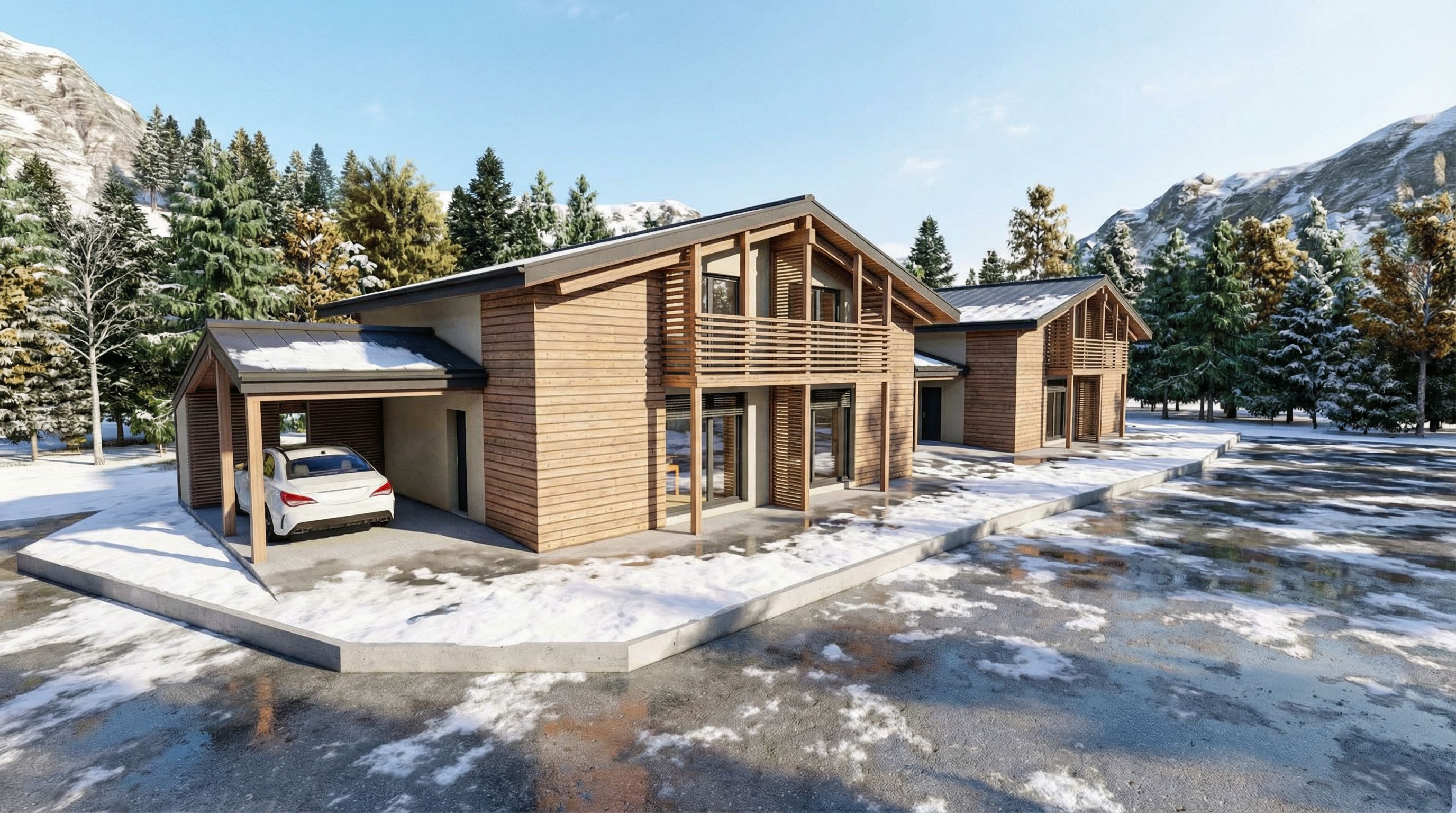 Promptarchitectural exterior rendering, render this sketch into photorealistic rendering, around trees and not too high mountain rocks, lights of a clear day some small snowy areas, no plants in front, keep exact camera angle, bright daylight, natural lighting, including trees, high quality, professional, detailed scene