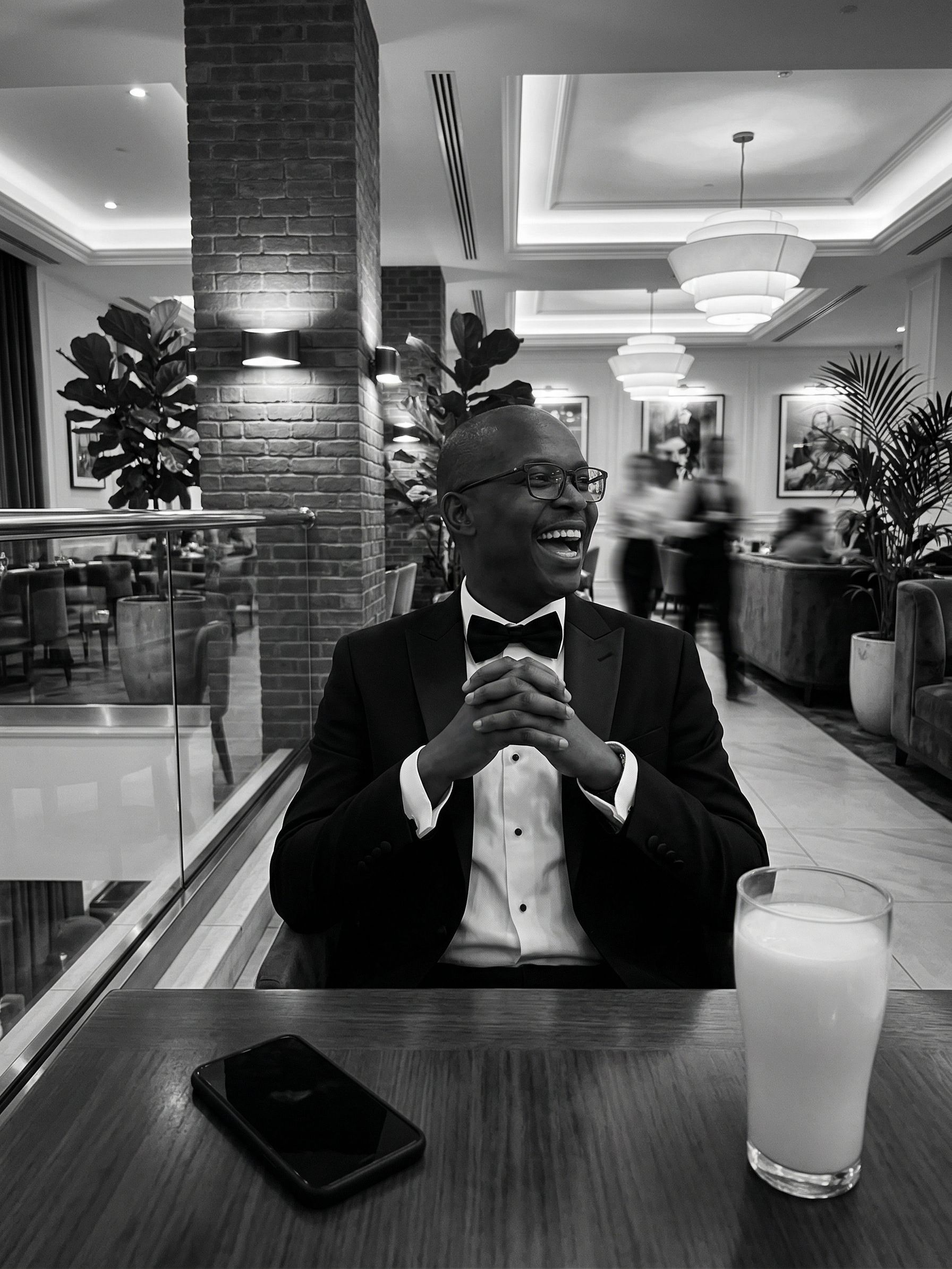 PromptPhoto of a vibrant outdoor café scene featuring a man expressing joy, surrounded by colorful umbrellas and greenery. The architecture includes rustic brick walls and decorative elements. Natural lighting highlights his features, casting soft shadows. Captured from a slightly elevated angle, focusing on the joyful expression, with a shallow depth of field emphasizing the foreground objects like the glass of milk and smartphone. Overall, aim for a lively, inviting ambiance that showcases the interaction between the individual and their surroundings. Use frameless glass on the balcony and black and white as the theme with mood lighting wall lighting. The person in the picture to wear a taxudo in the interior of a restaurant in newyork with elegant interiors., keep exact camera angle