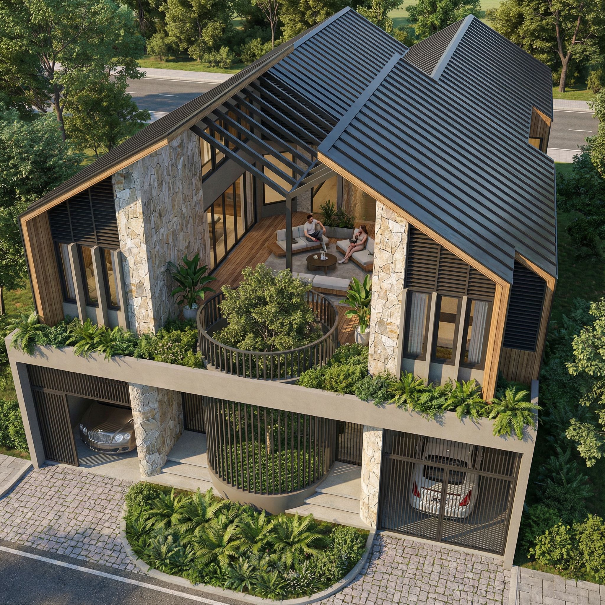 Promptarchitectural exterior rendering, render this photo into photorealistic rendering, make it hyper realistic, keep exact camera angle, including people, vehicles, greenery and vegetation, trees, high quality, professional, detailed scene