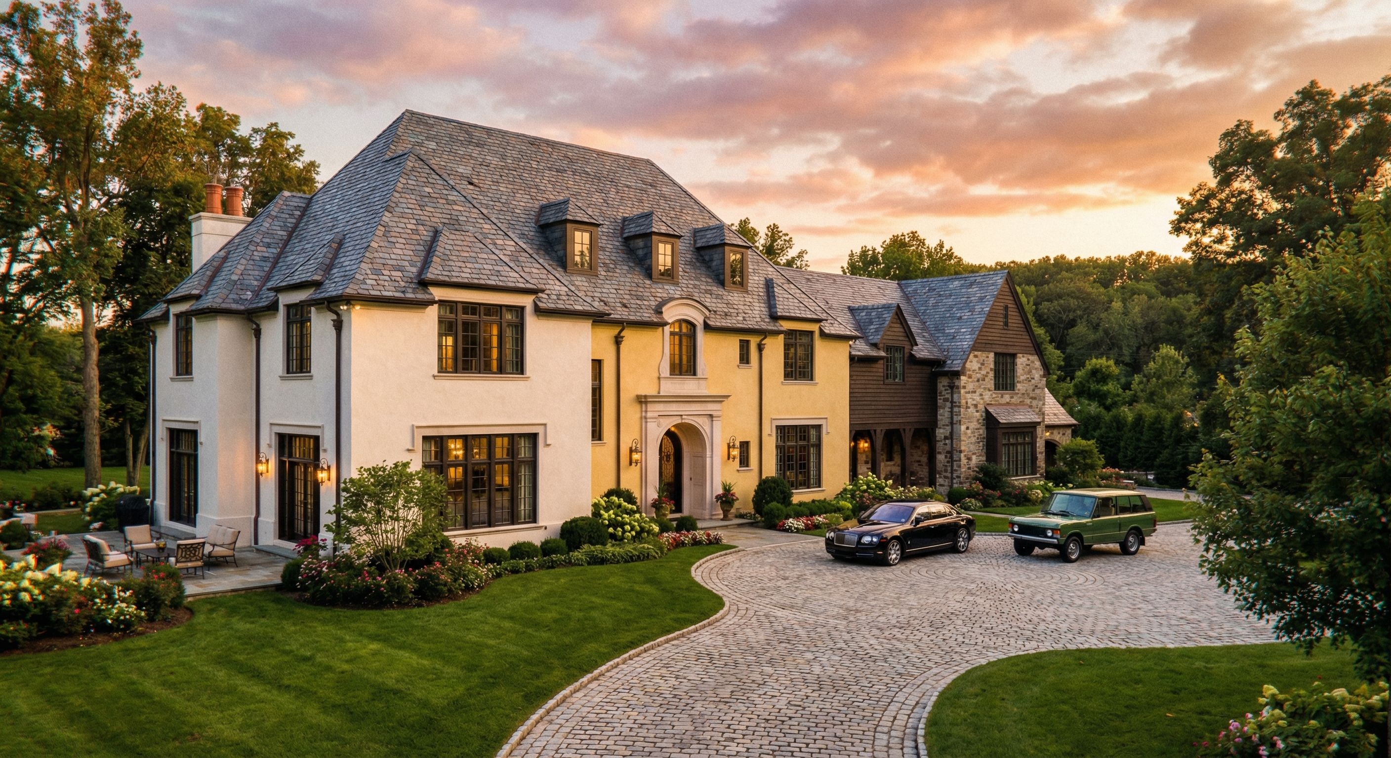 Photo of a large residential mansion featuring a blend of traditional and modern architectural elements, highlighted by intricate window designs and a grand entrance with arched doorways. The setting includes a manicured lawn, circular driveway, and adjacent patio furniture. Natural lighting casts soft shadows during golden hour, enhancing textures of the stucco and shingle roofing. Captured from a low angle, emphasizing the height and grandeur of the structure, with a wide-angle lens to encompass surrounding greenery and distant structures, providing a comprehensive view of the property., keep exact camera angle