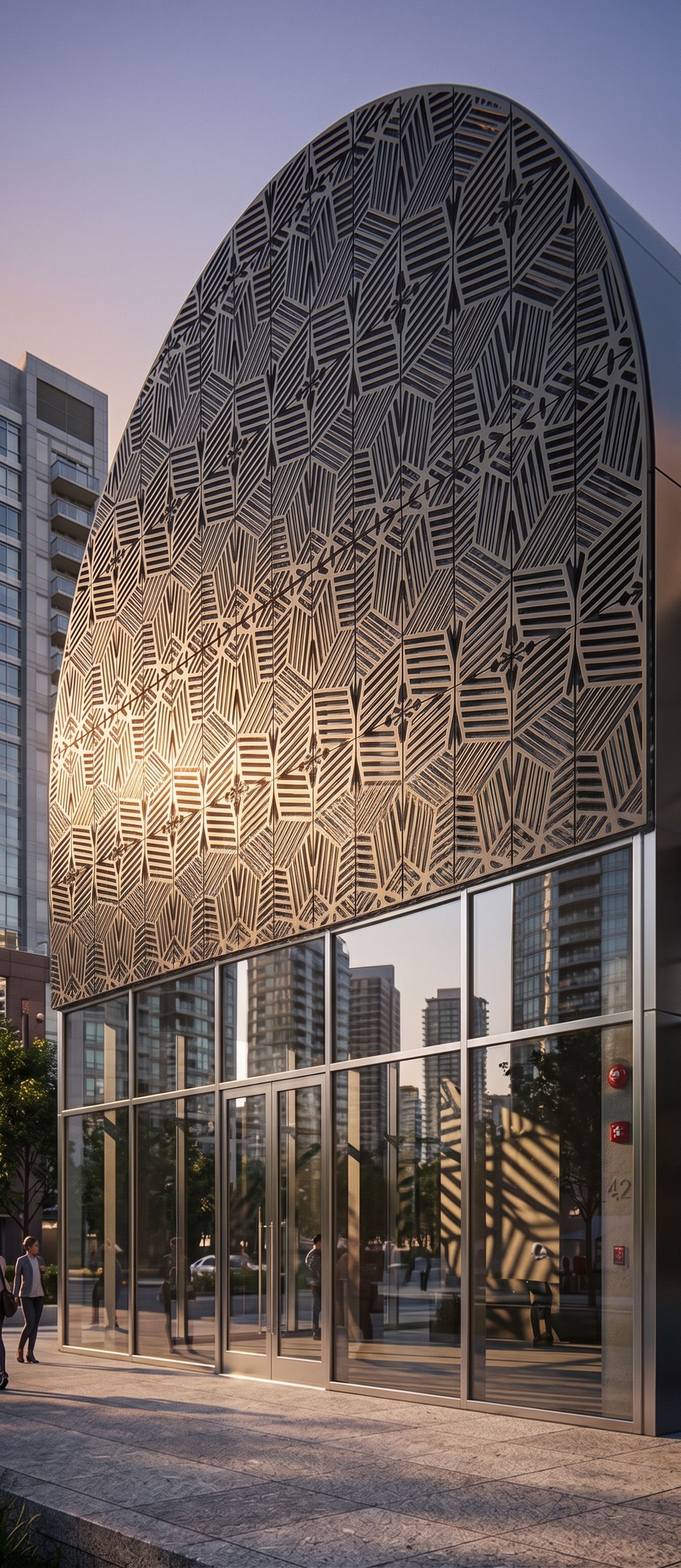 PromptPhoto of a modern commercial building featuring a unique patterned facade. Emphasize intricate geometric textures and sleek glass windows reflecting the urban landscape. Situated in a bustling city environment, nearby high-rise structures add depth. Capture late afternoon lighting with golden highlights illuminating the building's curves and patterns, casting dynamic shadows on the ground. Use a low-angle perspective to accentuate the structure's height and design, employing a wide-angle lens to enhance the spatial context and capture the lively atmosphere around it., keep exact camera angle