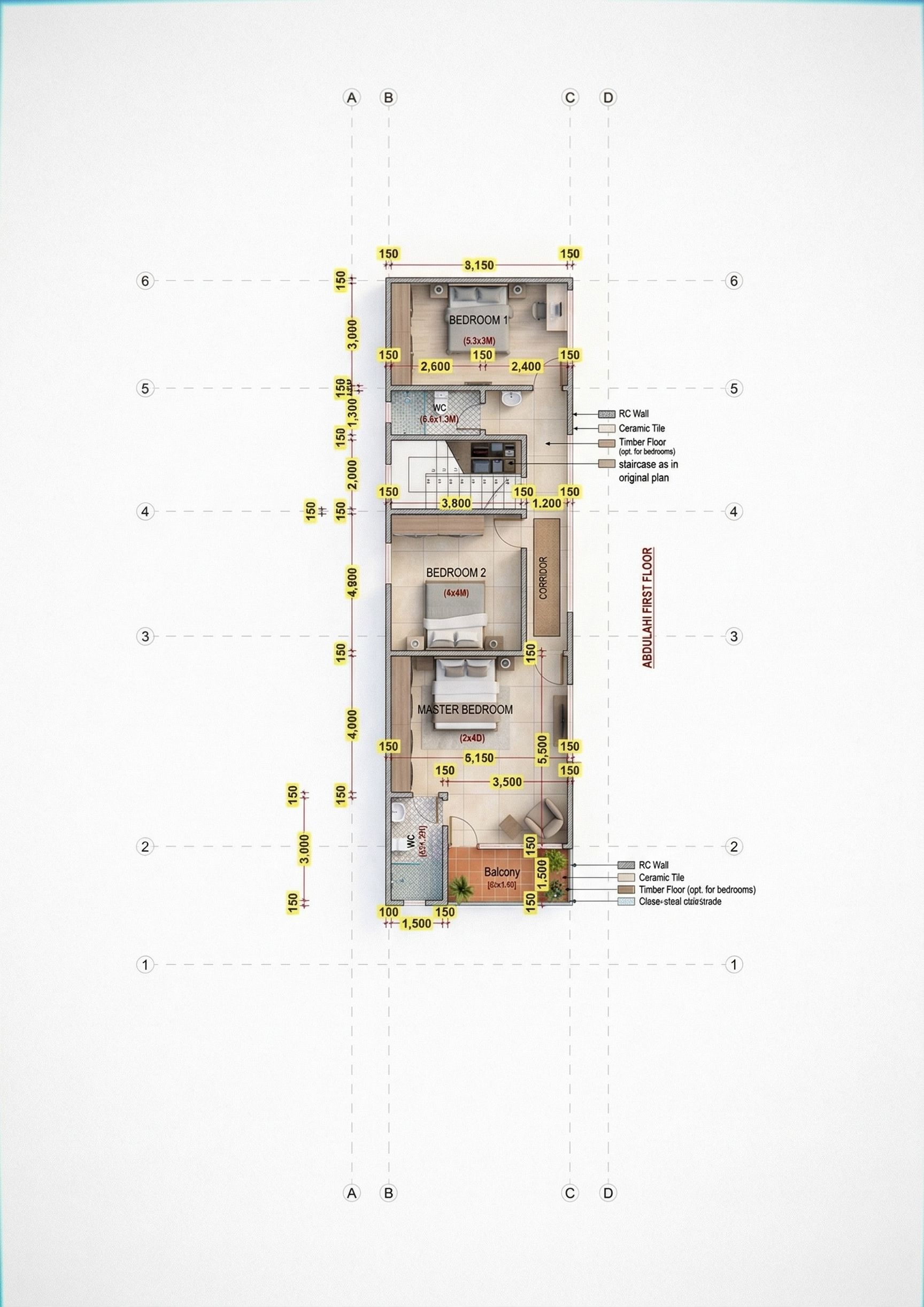 PLAN OF A HOUSE WITH CLEAR PARTITIONS. USE CERAMIC FLOOR TILES ON THE FLOOR. SOME GARDENING ALONG THE LEFT SIDE IN GREEN COLOUR. MAKE LAYOUT REALISTIC AND HIGH RESOLUTION 8K. KEEP ORIGINAL ANNOTATION. INCLUDE STAIRCASE AS IN ORIGINAL PLAN AND STORE UNDER STAIRCASE. MAINTAIN ORIGINAL LAYOUT BUT MAKE PARTITIONS CLEAR AND IMAGE HIGH RESOLUTION 8K. MAINTAIN ORIGINAL ANNOTATION. MAINTAIN ORIGINAL PLAN. REMOVE THE GARDEN ON THE LEFT., keep exact camera angle