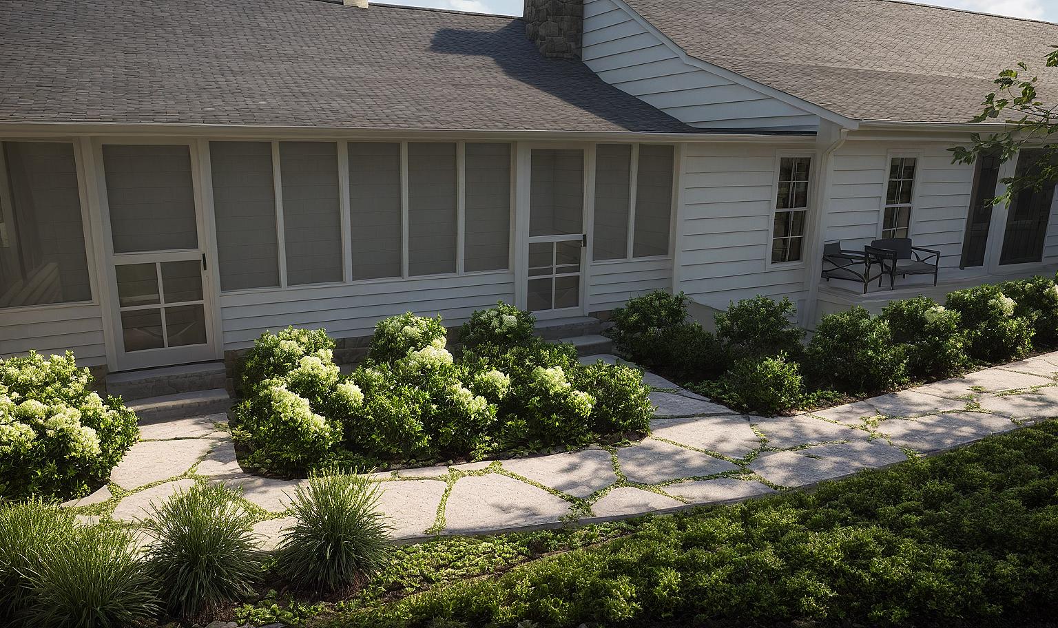 enhance, photo realistic, boxwoods, limelight hydrangeas