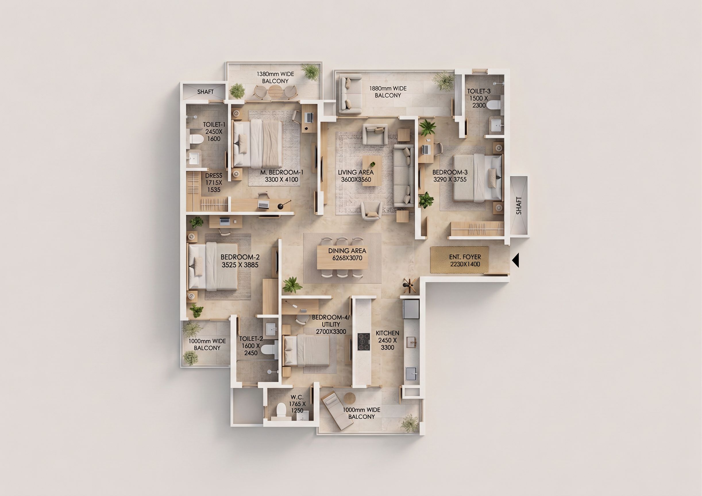 PromptTop-down photorealistic 3D floor plan render of a modern apartment, orthographic view with slight isometric depth (5–10 degrees), clean architectural layout. Use a warm neutral color palette with beige tile flooring, light oak wood finishes, and off-white walls. Soft ambient daylight lighting with very minimal shadows, diffused global illumination, no harsh directional sunlight. Fully furnished with minimal modern furniture: beds, sofas, dining table, wardrobes, kitchen counters. Add subtle decor like indoor plants and rugs but keep clutter minimal. Balconies with light stone tiles and simple outdoor seating. Glass railings where applicable. Maintain clear readable room labels and dimensions in a clean sans-serif font, aligned horizontally. High detail but low contrast rendering, matte materials (no glossy reflections), soft edges, realistic proportions. Camera perfectly top-down, centered composition, brochure-style presentation on a light neutral background. Ultra-clean, minimal, architectural visualization style, similar to premium real estate marketing floor plans., keep exact camera angle