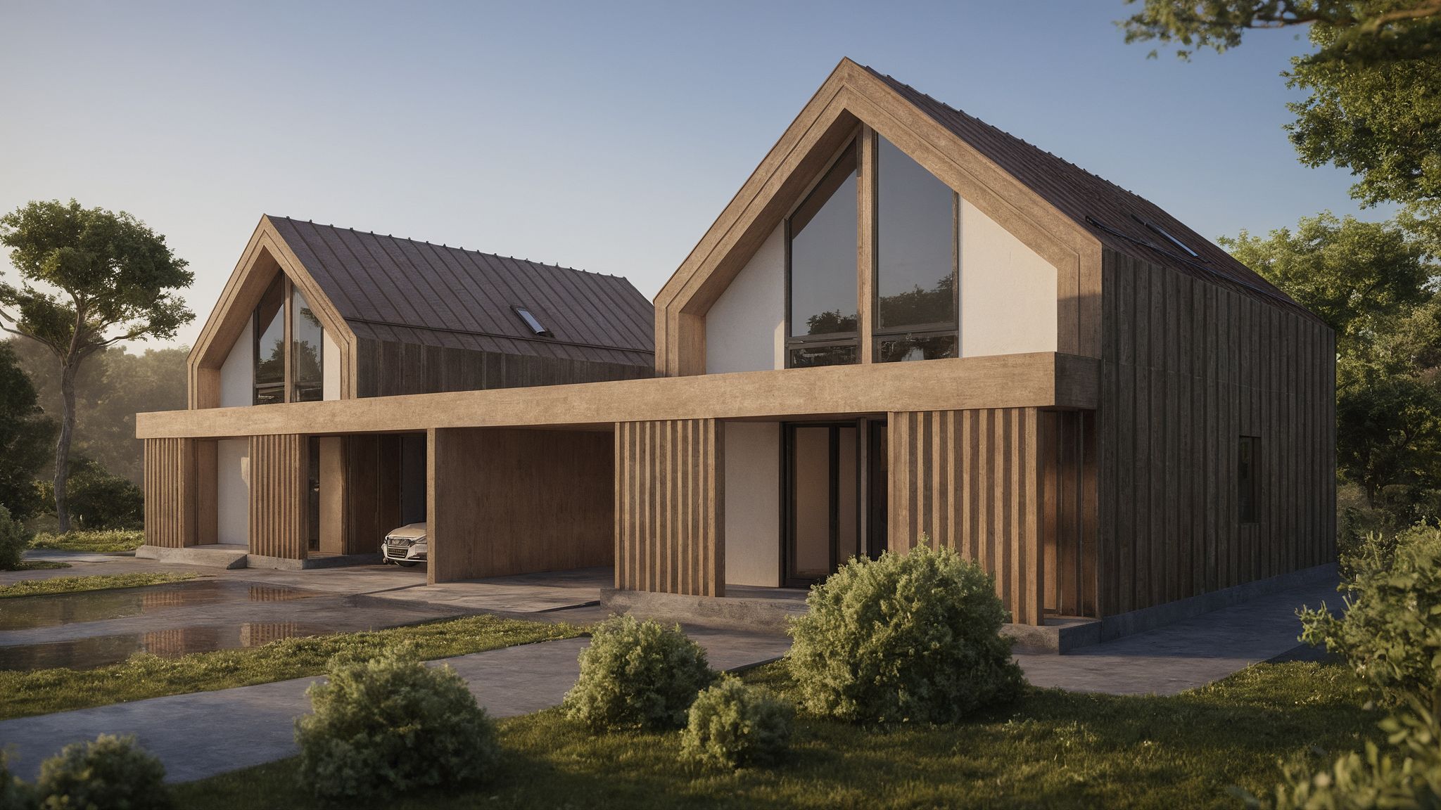 Enhance the realism of this building render. Keep all geometry, proportions, and material types exactly the same — do not alter the architecture. Increase the photorealism of plants, lighting, shadows, and surface textures. Refine reflections, ambient light, and materials so they look more natural and detailed. Preserve the bicycle in the scene exactly as it appears — do not modify, deform, or redraw it in any way; keep its geometry, proportions, wheels, spokes, and placement pixel-accurate. Use inpainting or local adjustments only outside the bicycle area. Keep colors vivid and balanced — avoid dull, gray, or blurry appearance. Maintain a crisp, high-quality, realistic look with natural contrast and lighting.
