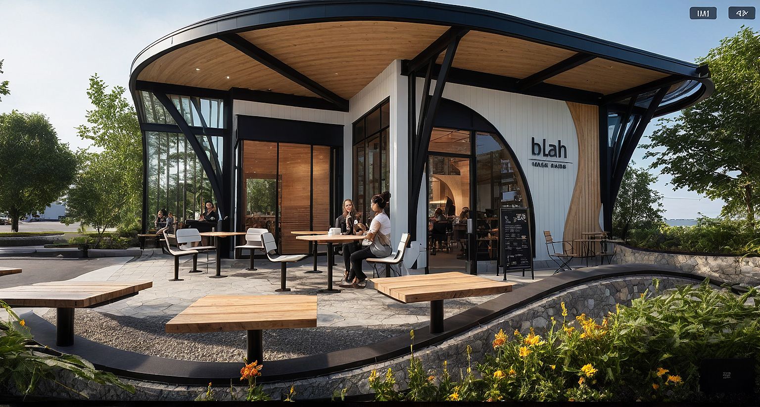 PromptPhoto of a modern café with an organic, curved design featuring large glass windows and wooden accents. Emphasize the contrast between the sleek black framing and natural wood textures, white siding on walls. with outdoor seating surrounded by vibrant greenery and flowering plants. Daytime lighting casts soft shadows, highlighting the building's unique roof structure (slatted wood with sunshade fabric overtop). Capture the scene from a low angle, focussing on the café’s inviting entrance and the patrons enjoying their time, using a wide-angle lens to enhance the expansive feel of the surrounding landscape.