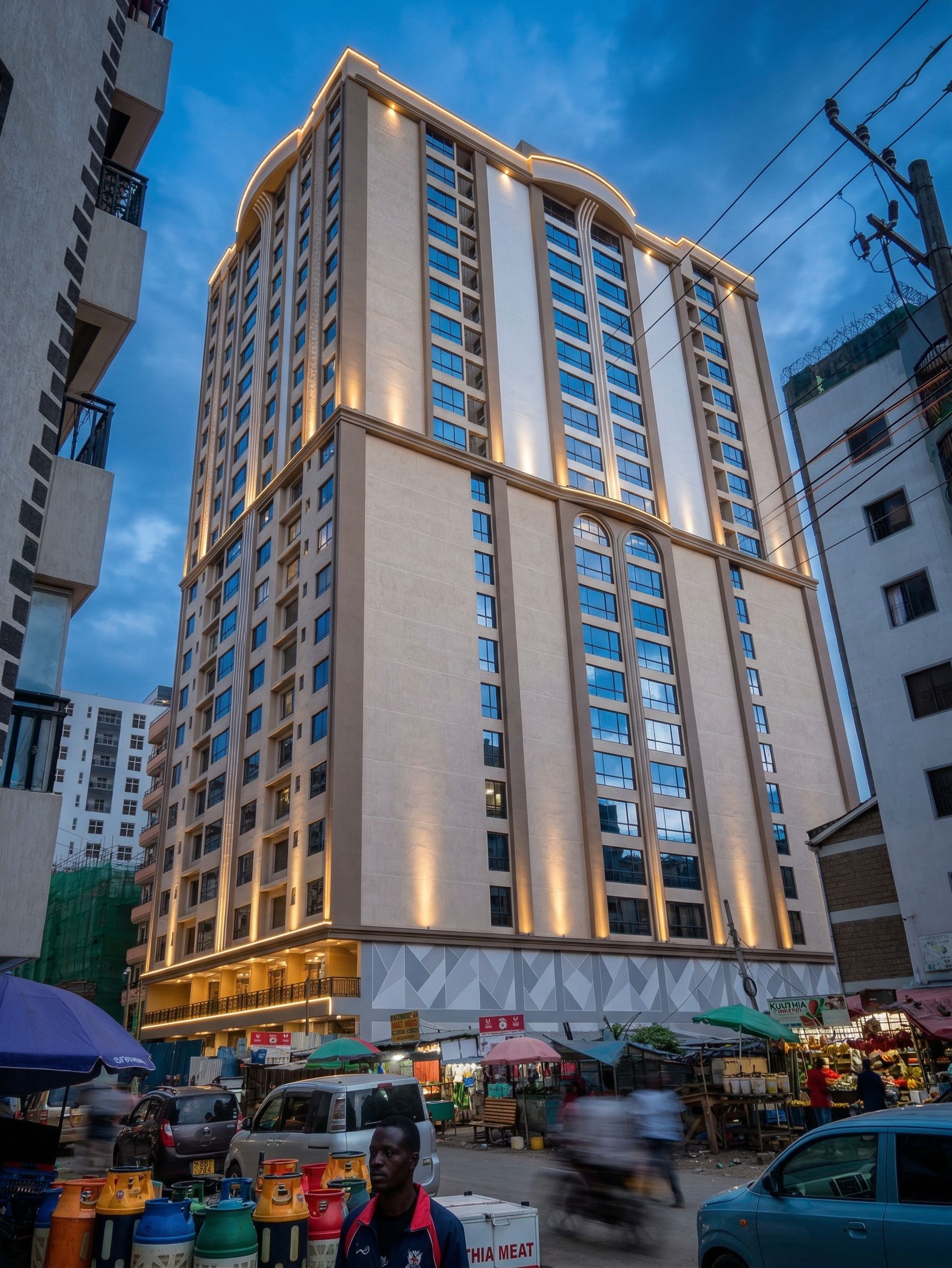 Exterior of a building with pastel grey and white wall master on the wall. Make glass clear, realistic and reflective. Introduce rope lights and spot lights in the building. Turn on the lights. Make render high resolution 8k. Make building beige..use a darker shade of beige on pillars ,beams and moldings. Use brilliant white wall master on the building., keep exact camera angle