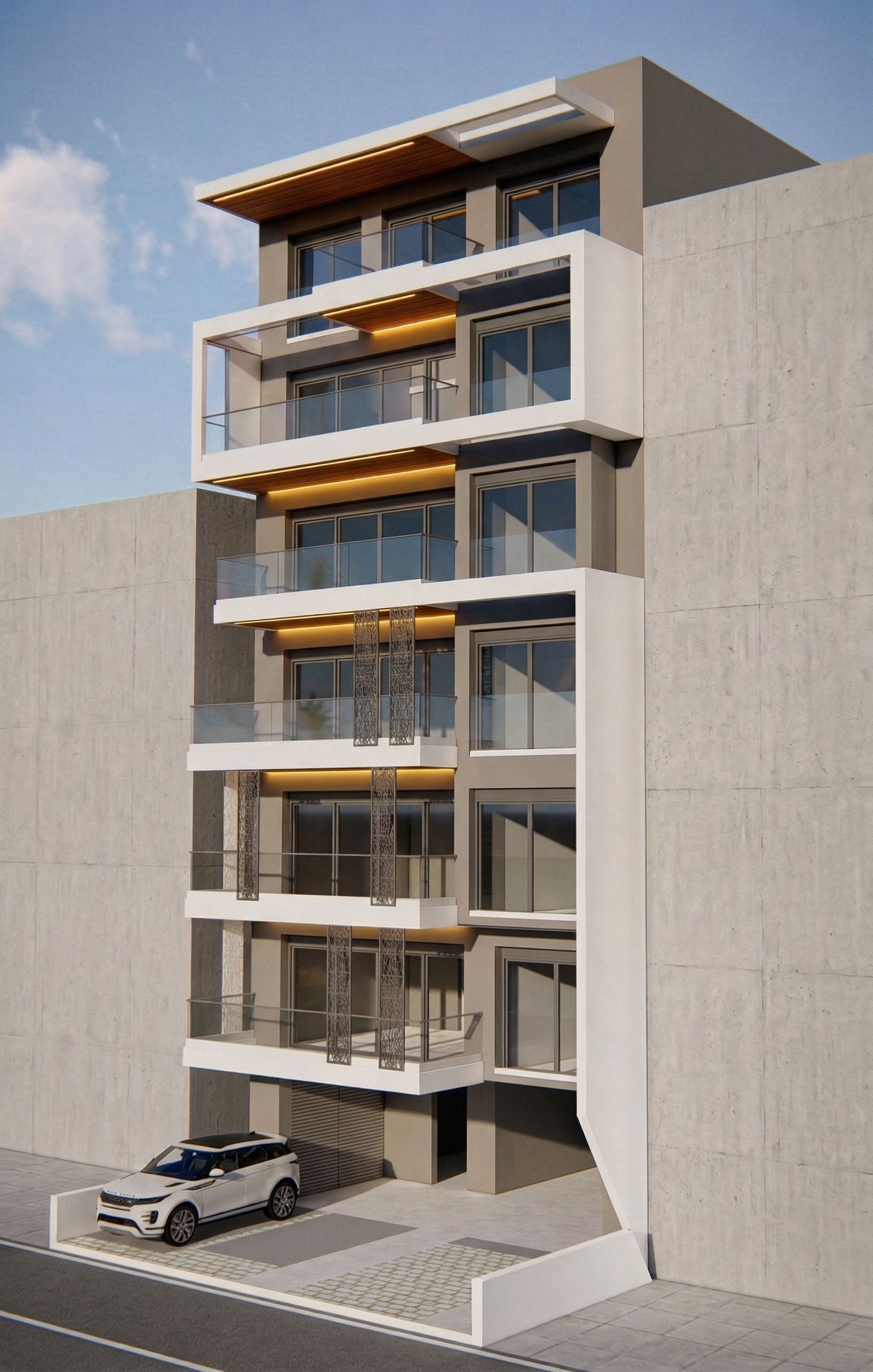 Photo of a modern apartment building featuring sleek lines and contemporary balconies. Emphasize , expansive glass windows, and wooden tops of balcony accents. Capture natural sunlight enhancing the architectural details, with soft shadows cast by the balconies. Basic color ral 7006 and some beige details with white balconies. Dont change the building. No trees .Do light grey the right and left box. Grammical yellow Light in the wooden balcony, keep exact camera angle, white balconies, keep exact camera angle