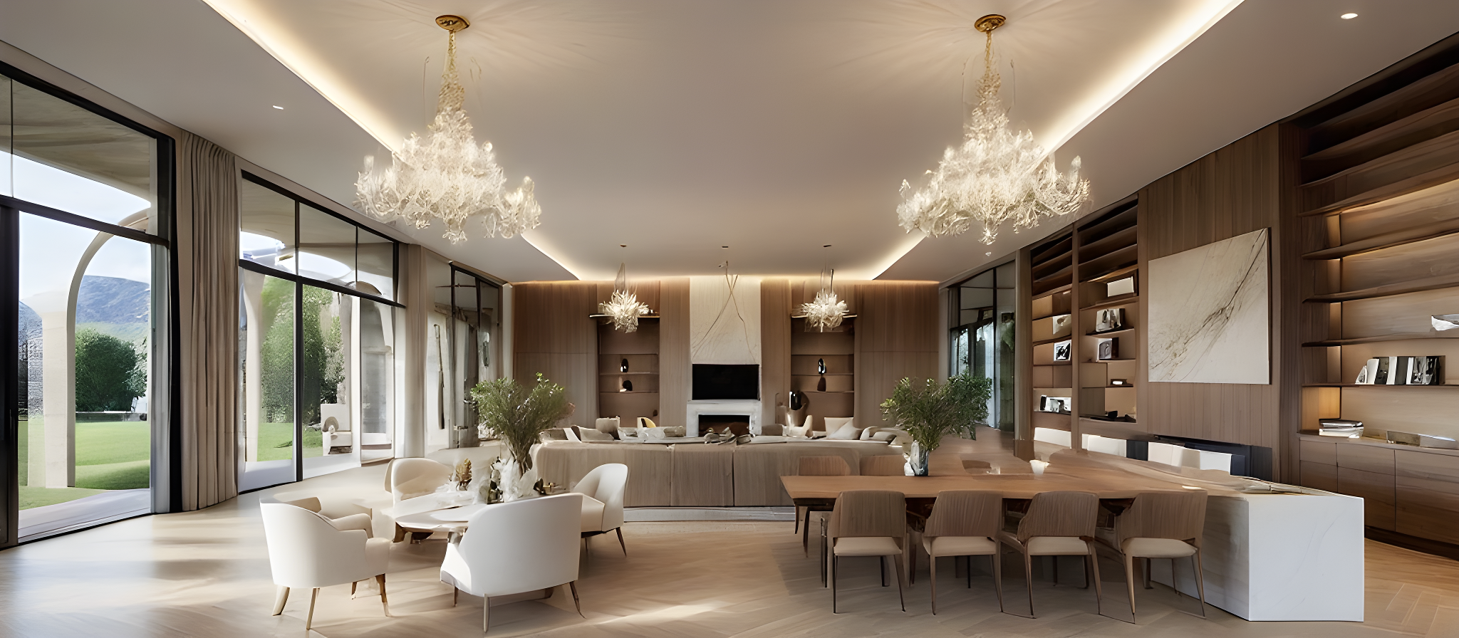 natural daylight with shadows from trees white oak floor walnut bookshelf with linear light smooth beige limestone backdrop white drop ceiling with cornice and linear lighting around crystal chandelier view of English garden and mountain outside through smooth limestone arch keep exterior wall and arch
