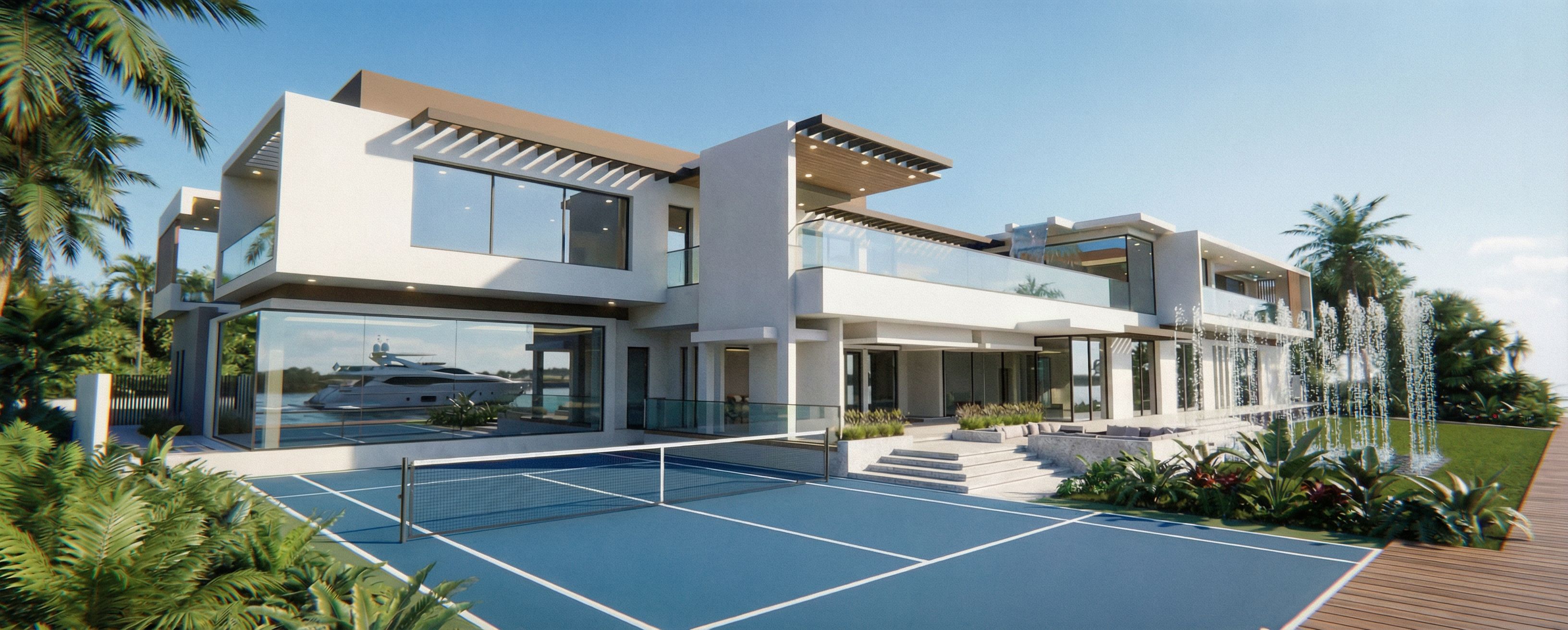 PromptLA FRANJA DE PISO BLANCO EN FRENTE AL PASTO Y AL PASTO DE LA CANCHA CAMBIARLO POR DECK DE MADERA. EL RESTO CONSERVARLO COMO ESTA., keep exact camera angle