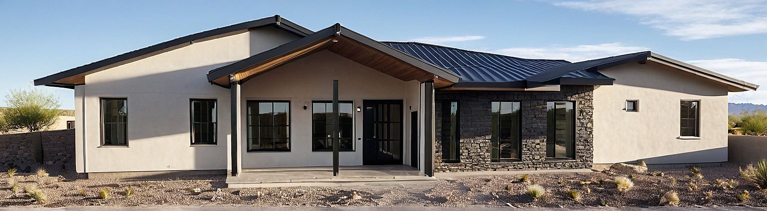 white stucco exterior, black standing seam metal roof, black metal door, desert colored stacked stone courtyard walls, 3 foot wide concrete walkway around house, grass landscape, desert southwest landscape