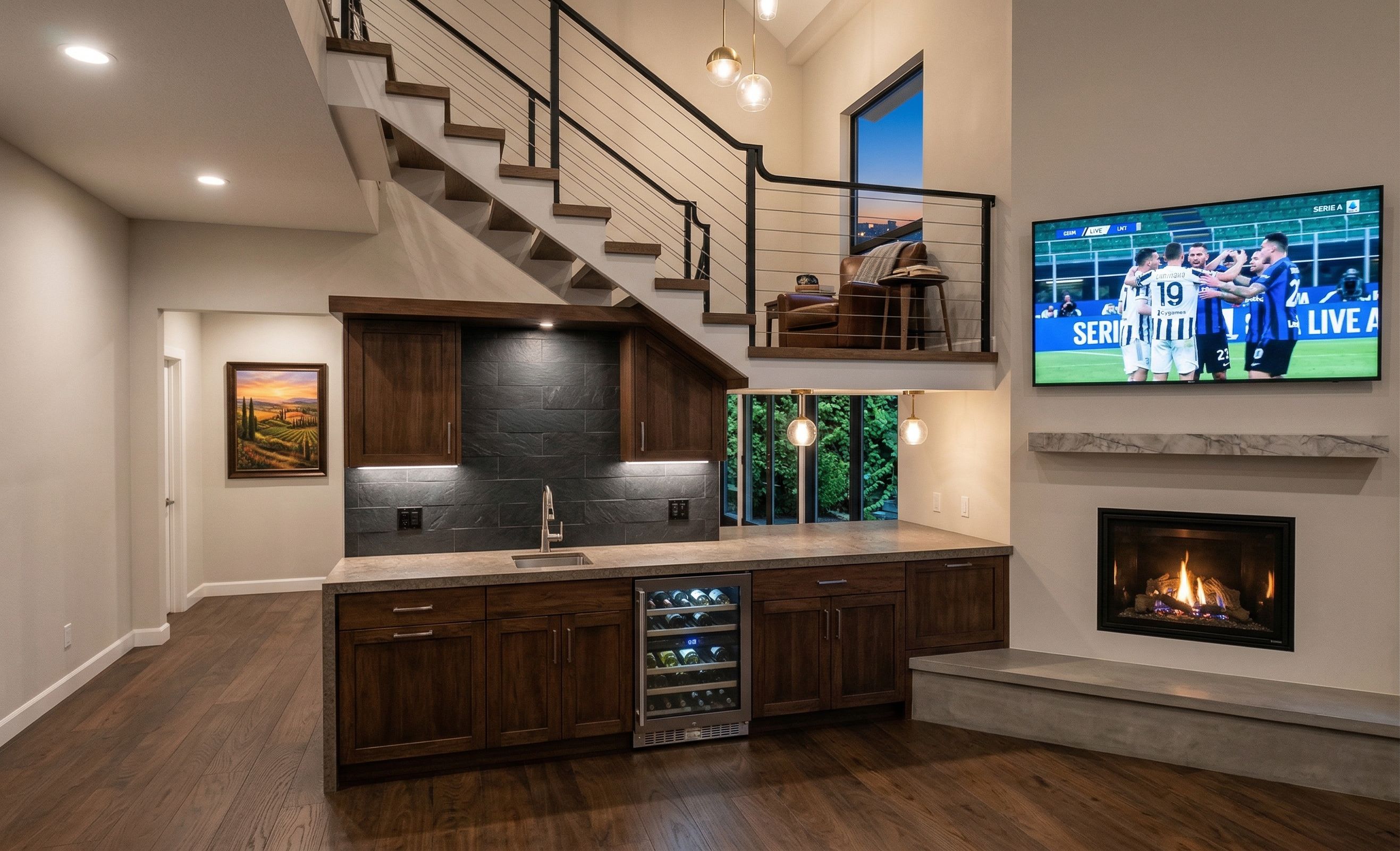 make photorealistic rendering from this image add wet bar under the stairs next to fireplace as indicated by red area design it so the fireplace and wet bar are connected fireplace is direct vent gas fireplace, show fireplace on burning, fireplace wall is drywall TV above the fireplace is playing Italian soccer game change yellow picture frame with Italian countryside scene skies trough the existing stair window do not add more windows green scenery through lower glass door and windows lights on in the room add light fixtures where appropriate, keep exact camera angle