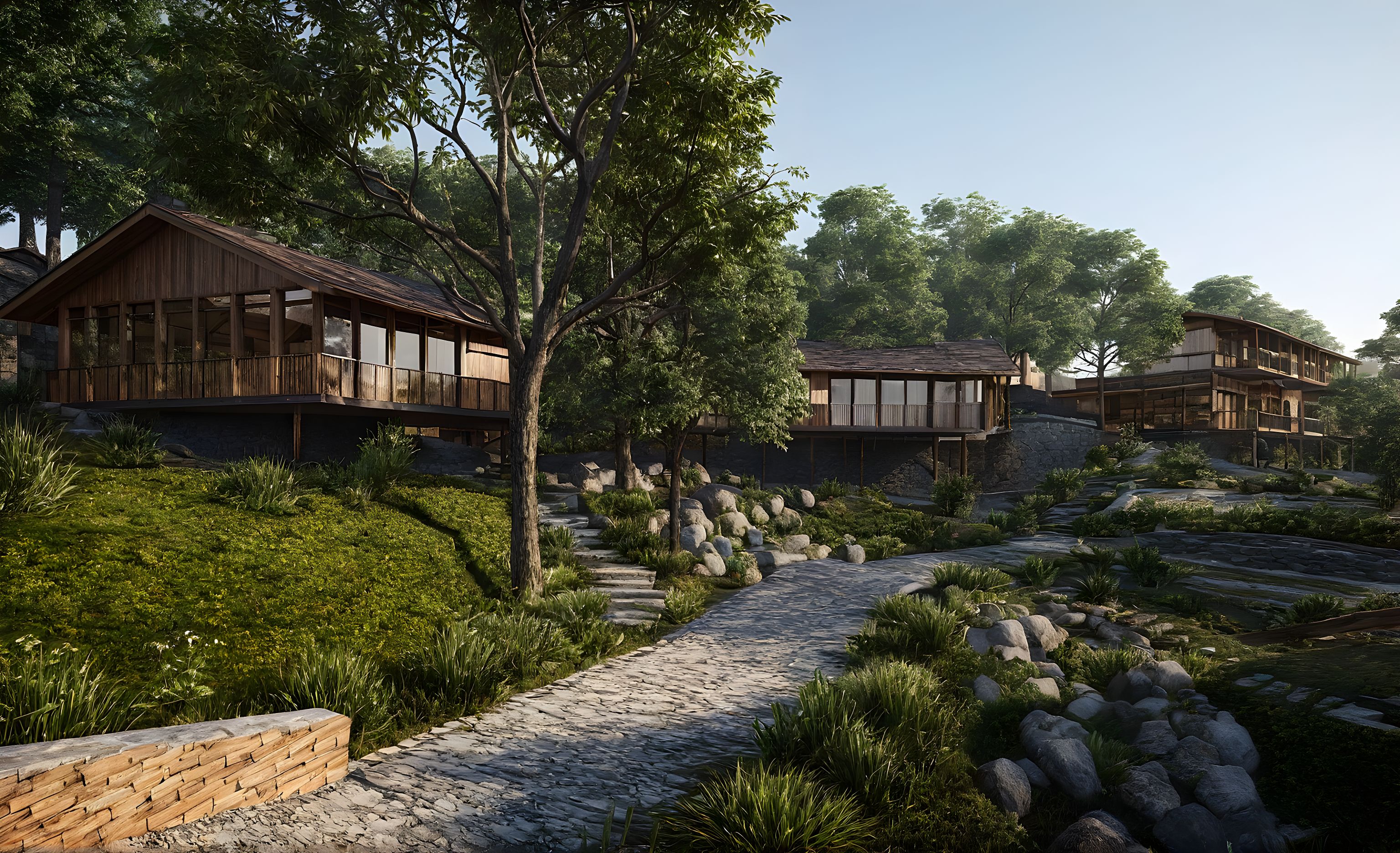 PromptEnhance this mountain resort in Uttarakhand, India, using precise rendering mode. Maintain all existing design elements exactly as shown — no alterations or additions. Apply handcrafted, non-tiled textures to the wooden facades, stone pathways, and shingled roofs. Emphasize natural realism with rich, varied vegetation including Himalayan-native flora, realistic bark on trees, and individual leaf detail. Render soft morning light casting warm highlights and gentle shadows across the scene. Include subtle dew on the plants and damp sheen on stones to evoke a fresh, cozy early morning vibe. Add distant valley haze and a calm, inviting atmosphere that blends built and natural elements seamlessly.