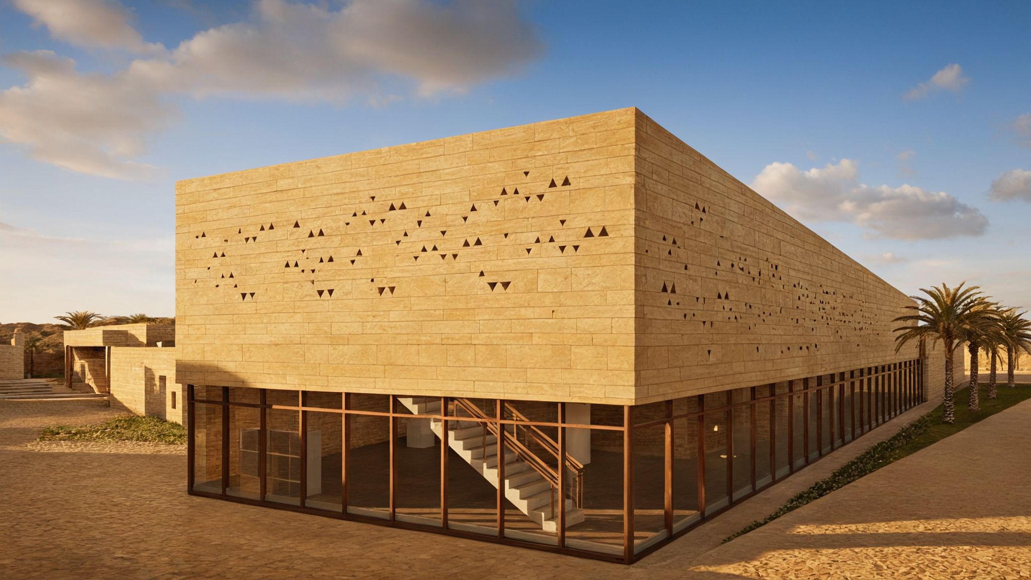 PromptA realistic architectural render of a modern stone building inspired by Najdi architecture, with warm golden lighting similar to late afternoon in Riyadh. The atmosphere feels calm and elegant, with soft shadows, detailed Riyadh stone texture, subtle reflections on glass, and a balanced tone. The design, proportions, and materials remain exactly as in the input image, with a realistic professional-photography style like the Diriyah architecture visuals.