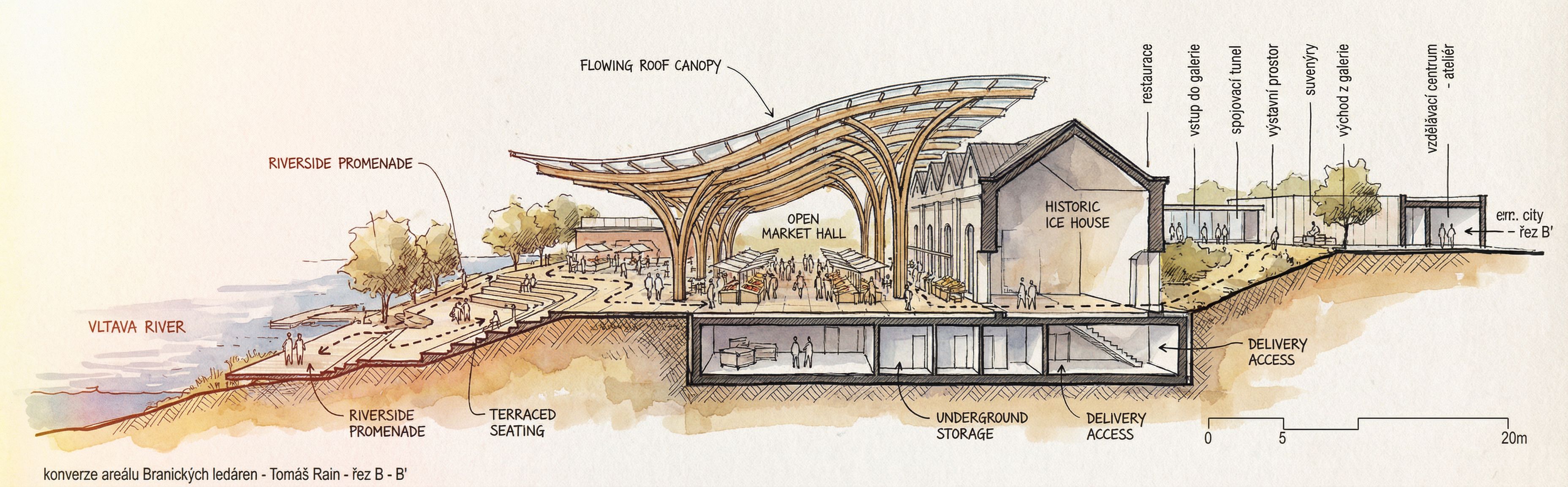 Create a clean architectural section diagram through a riverside market project at the Braník Ice House in Prague. The drawing should clearly explain the relationship between terrain, the historic ice house building, the new market space, and the river. Show these elements clearly: • the river and riverside promenade on one side of the section • terrain sloping from the city toward the river • the historic ice house building partially embedded in the terrain • a new large flowing roof structure above the building PROGRAM ORGANIZATION • a lower underground level below terrain used for storage, cooling rooms and service logistics • delivery and supply access to this lower level separated from public circulation • the ground level as the main public level with an open market hall • people moving freely through the market space at ground level ROOF STRUCTURE • a large expressive roof canopy above the market inspired by flowing water • tree-like branching columns supporting the roof • the roof extending beyond the building footprint to cover outdoor market areas PUBLIC MOVEMENT • pedestrian circulation from the river promenade toward the market • people entering from multiple directions • arrows showing circulation flows WATER RELATIONSHIP • steps and terraces descending toward the river • public waterfront space connecting the market with the water STYLE architectural section diagram, clean architectural graphics, minimal line drawing, competition presentation style, white background, simple colors, arrows explaining circulation, architectural storytelling diagram., keep exact camera angle