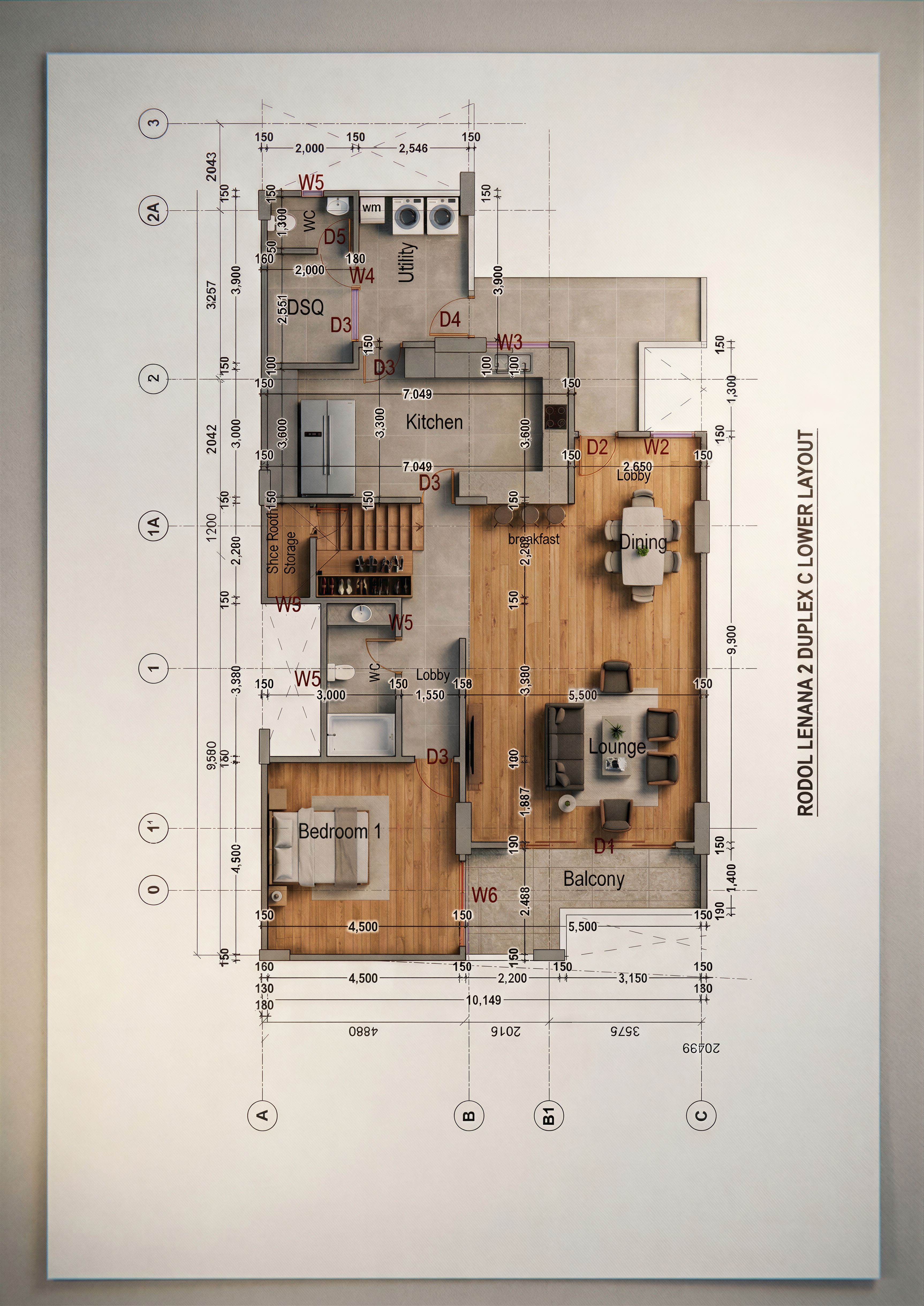 EnhancedPromptLAYOUT SHOWING THE INTERIOR OF A HIGH END APARTMENT. CLEARLY SHOW THE PARTITIONS WITH THE FLOOR FINISHES. USE TIMBER AND CERAMIC TILES ON THE FLOORS. INCLUDE A WASHER AND DRIER IN THE UTILITY AREA. INCLUDE INBUILT DOUBLE DOOR FRIDGE NEXT TO THE PANTRY. CLEARLY INDICATE THE WASHROOMS. MAKE LAYOUT HIGH RESOLUTION OF 8K. USE THE REFERENCE FILE BUT MAINTAIN ORIGINAL ANNOTATIONS AND LAYOUT DESIGN., keep exact camera angle