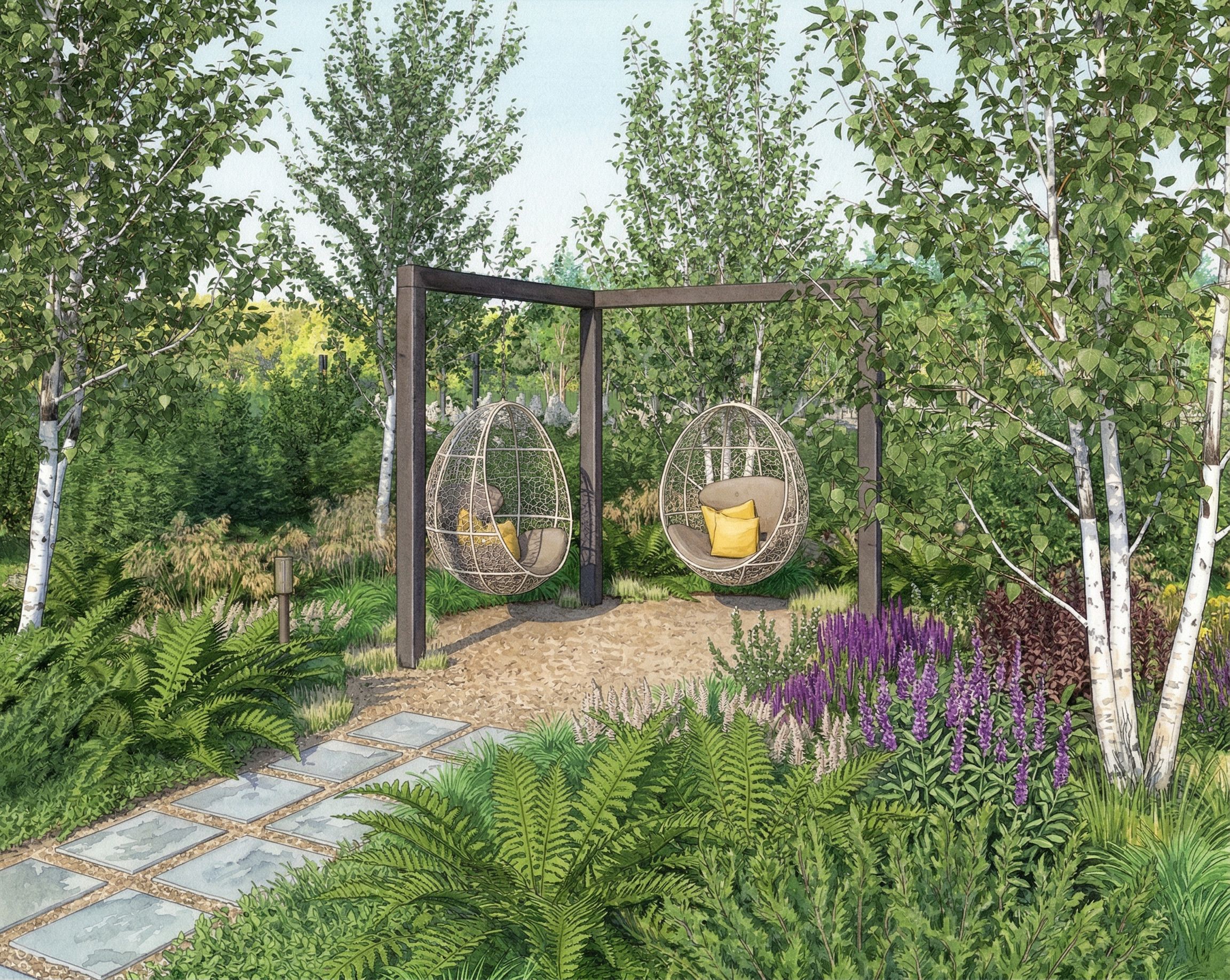 Transform this landscape into a detailed botanical watercolor illustration. Precise, controlled watercolor painting with careful layered washes building up depth of color, accurate plant species rendering with botanical detail, fine brushwork for leaf textures and flower details, subtle glazing for shadows, bright clean colors. Scientific illustration meets landscape design. Same composition. No signatures. Accurate plant species, keep exact camera angle