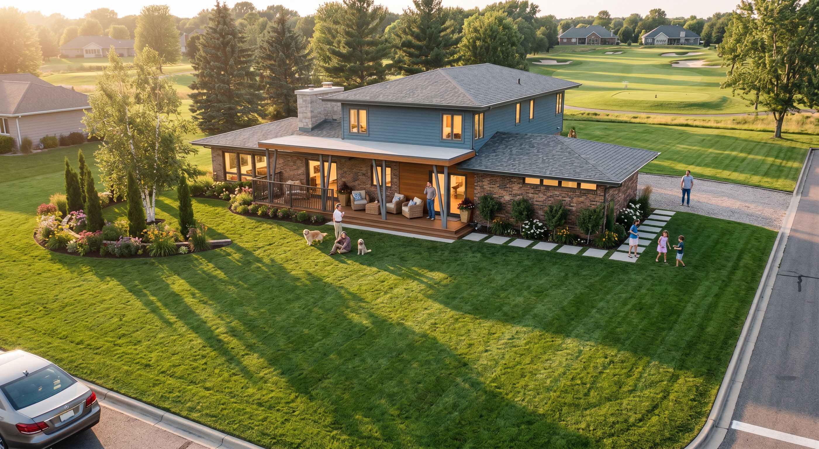 PromptPhoto of a contemporary single-family home nestled in a lush, blue lap siding green landscape. Highlight the warm wooden elements, clean lines, and modern textures. The inviting porch features stylish outdoor seating surrounded by carefully manicured gardens and native trees. Natural sunlight casts soft shadows, creating a serene atmosphere during golden hour. Capture the scene from a slightly elevated angle, using a wide-angle lens to encompass both the home and its vibrant surroundings, enhancing the spacious feel of the property. Asphalt shingle grey roof. Metal V colums grey, golf coarse in background behind houses. add interior lighting and girls and boys , keep exact camera angle
