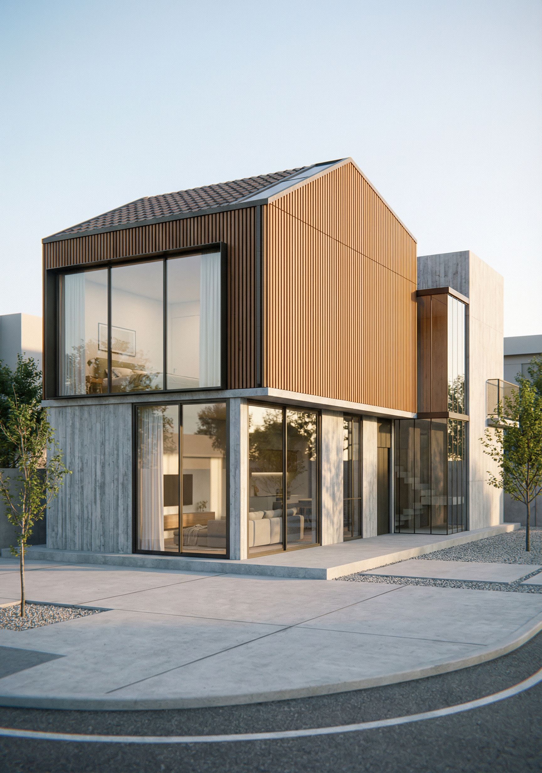 Photo of a modern two-story residential building featuring a mix of concrete and wood paneling. The architectural design highlights expansive glass windows, allowing natural light to flood the interiors, and a unique sloped roof. Set in an urban context with minimal surrounding structures, showcasing a clean landscape. The scene is illuminated by soft morning light casting gentle shadows, enhancing texture details. Captured from a low angle to emphasize the height and depth of the structure, using a wide-angle lens for a dramatic effect.