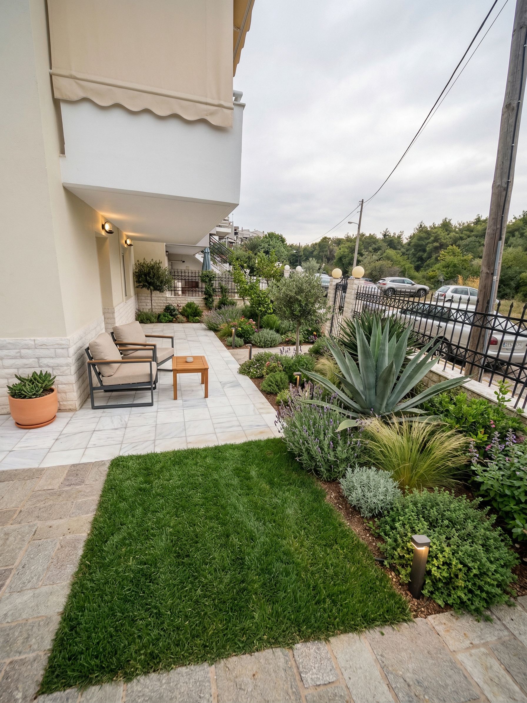 Promptcreate a beautiful exterior garden with furniture and a little grass. Remove the small wall and the stone in walls between the greenary, keep exact camera angle