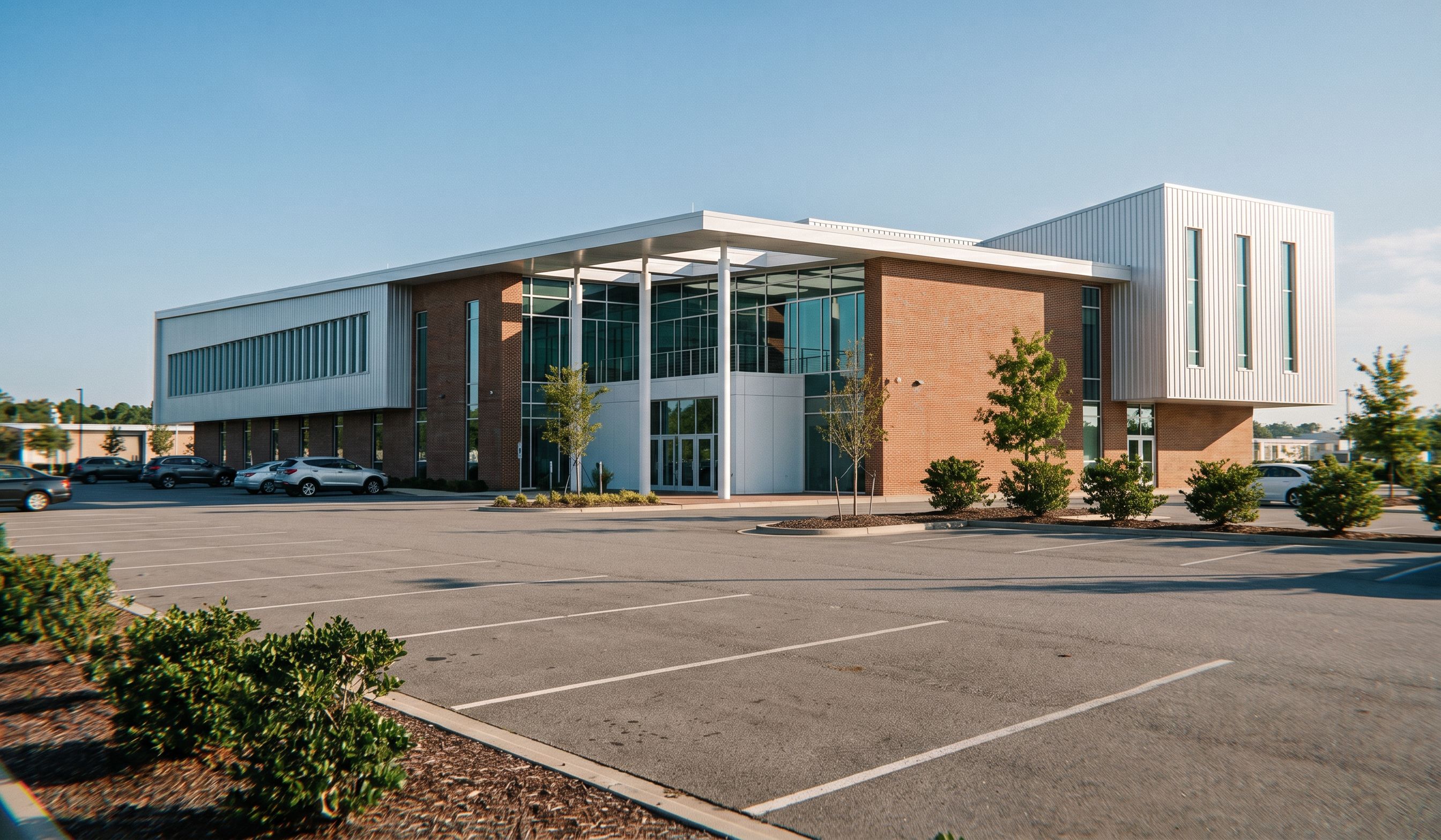 This is a stormwater operations control command center in Virginia Beach. Keep the base image the same, and render the materials as they show up. The corrugated metal on the outside should be lighter aluminum., keep exact camera angle