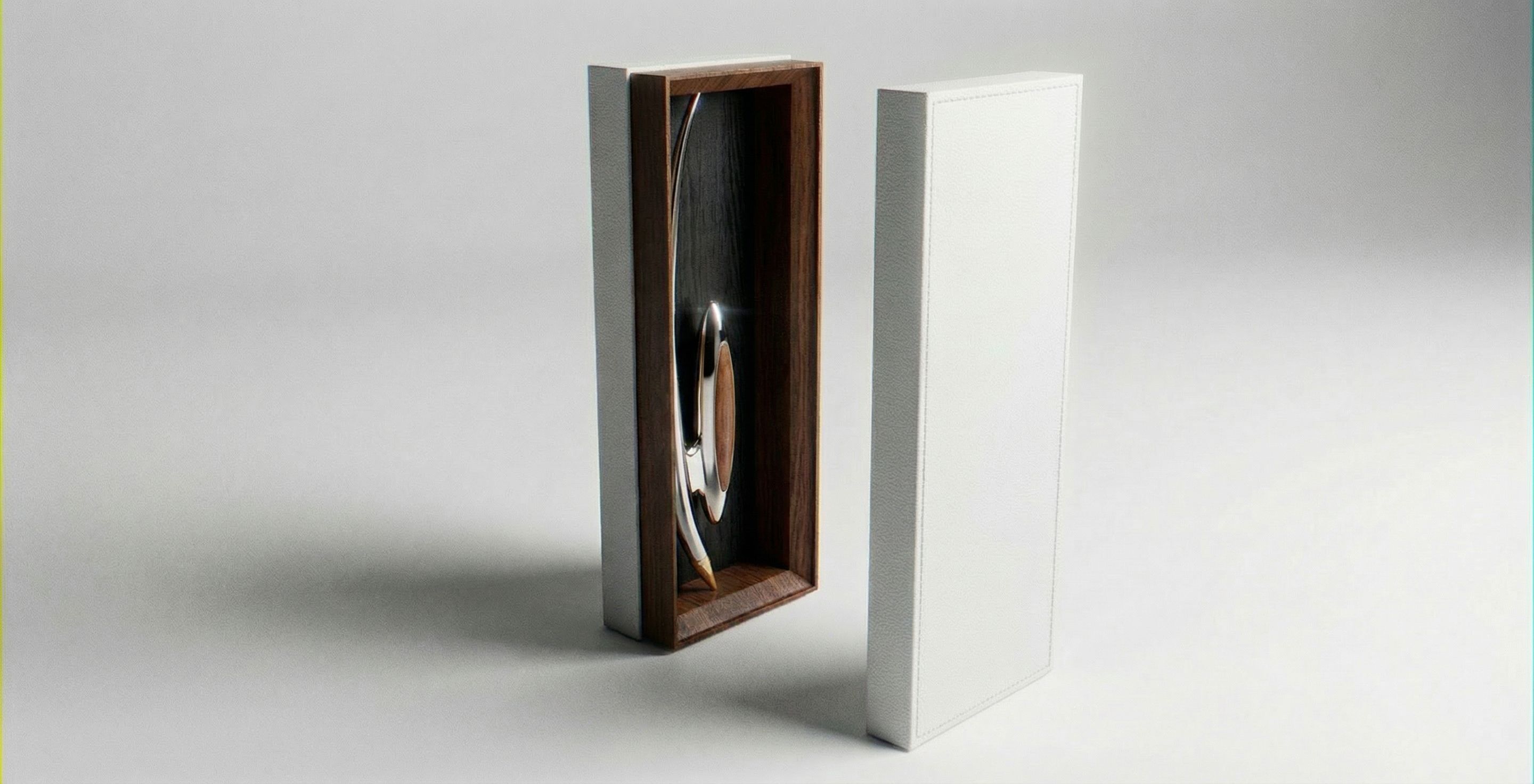 PromptREPLACE THE GOLD-COLOURED BOX BOTTOM BEHIND THE PEN WITH A BLACK WOOD GRAIN FINISH., keep exact camera angle