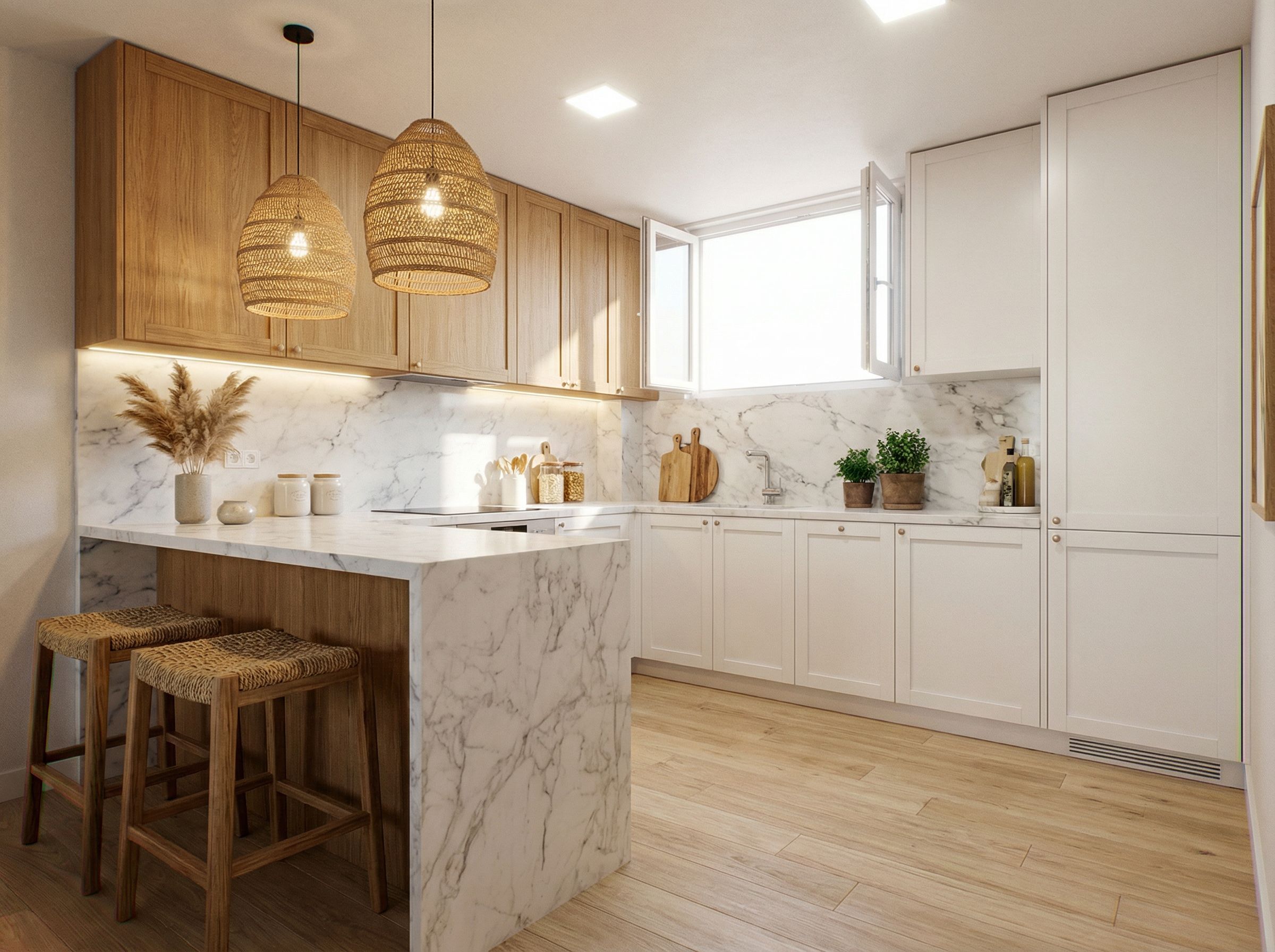 Prompt Retirar todos os moveis da cozinha e objectos da cozinha, colocar chao em madeira e mantendo o layout da imagem remodelar a cozinha como na referencia, janelas todas abertas e luzes acesas, keep exact camera angle