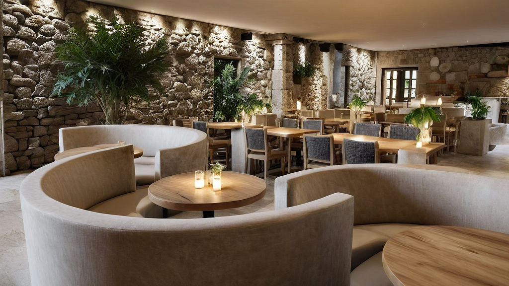 Promptrestaurant with Greece touch with sculptures and plants and stone walls