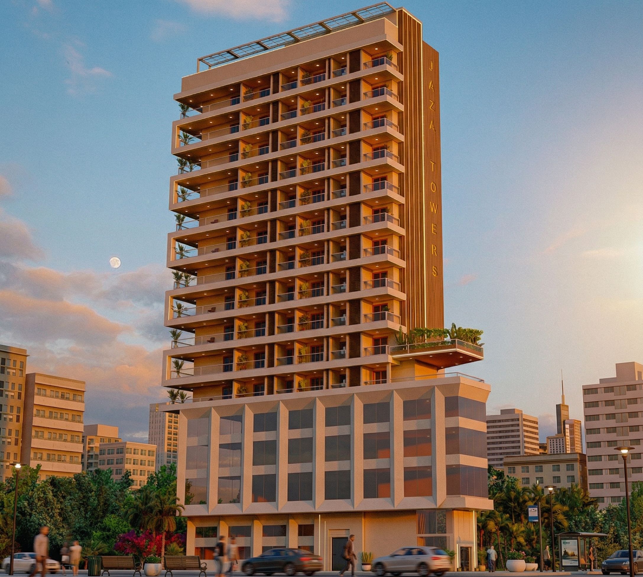 a super realistic render of a high rise residential cum commercial building with a nice cityscape, keep exact camera angle