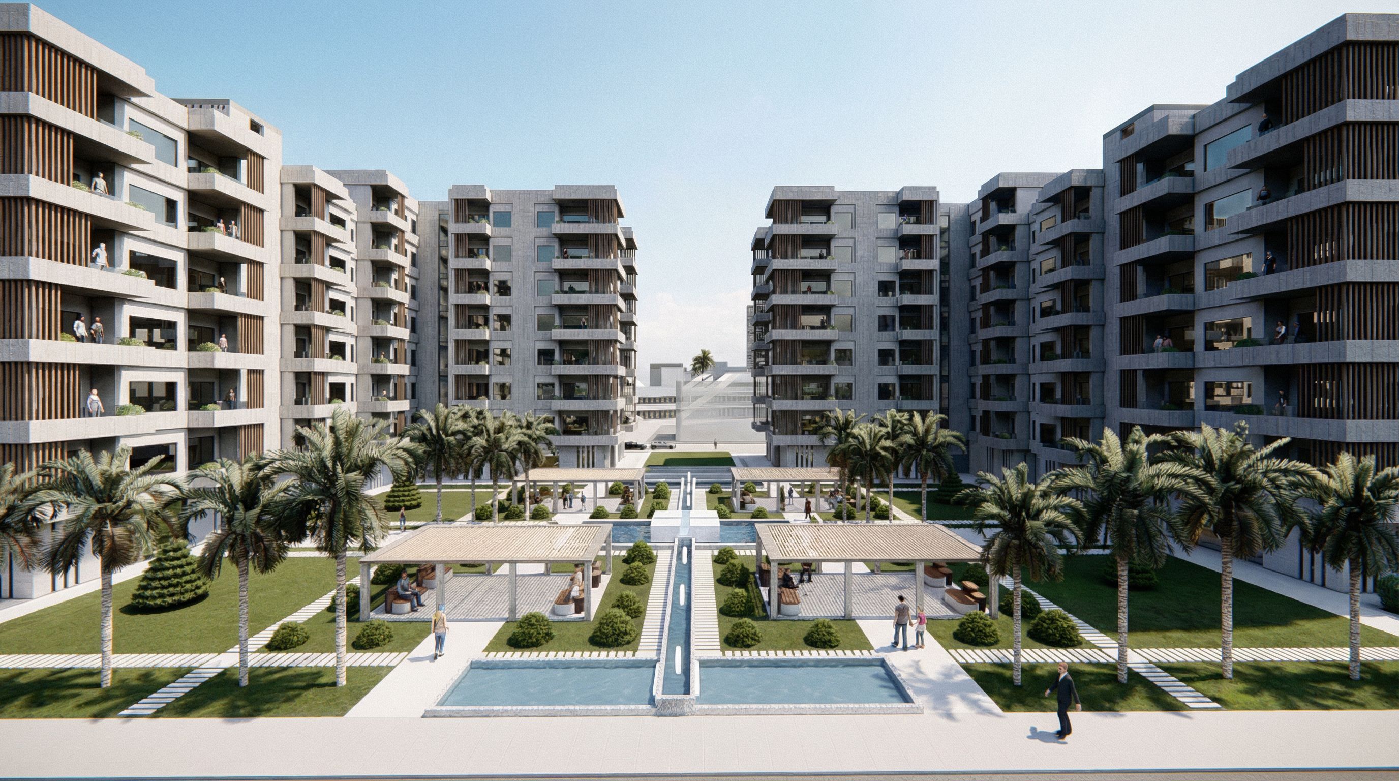 Photo of a modern residential complex featuring multiple contemporary apartment buildings with balconies. Architectural details include textured concrete facades, wooden accents, and large glass windows. The urban setting encompasses green landscaped areas with palm trees, a swimming pool, and shaded seating zones. The scene is illuminated by soft afternoon sunlight, casting gentle shadows and enhancing the textures of the materials. Captured from a low angle to emphasize the height of the buildings, using a wide-angle lens for a dynamic perspective of the surrounding landscape.