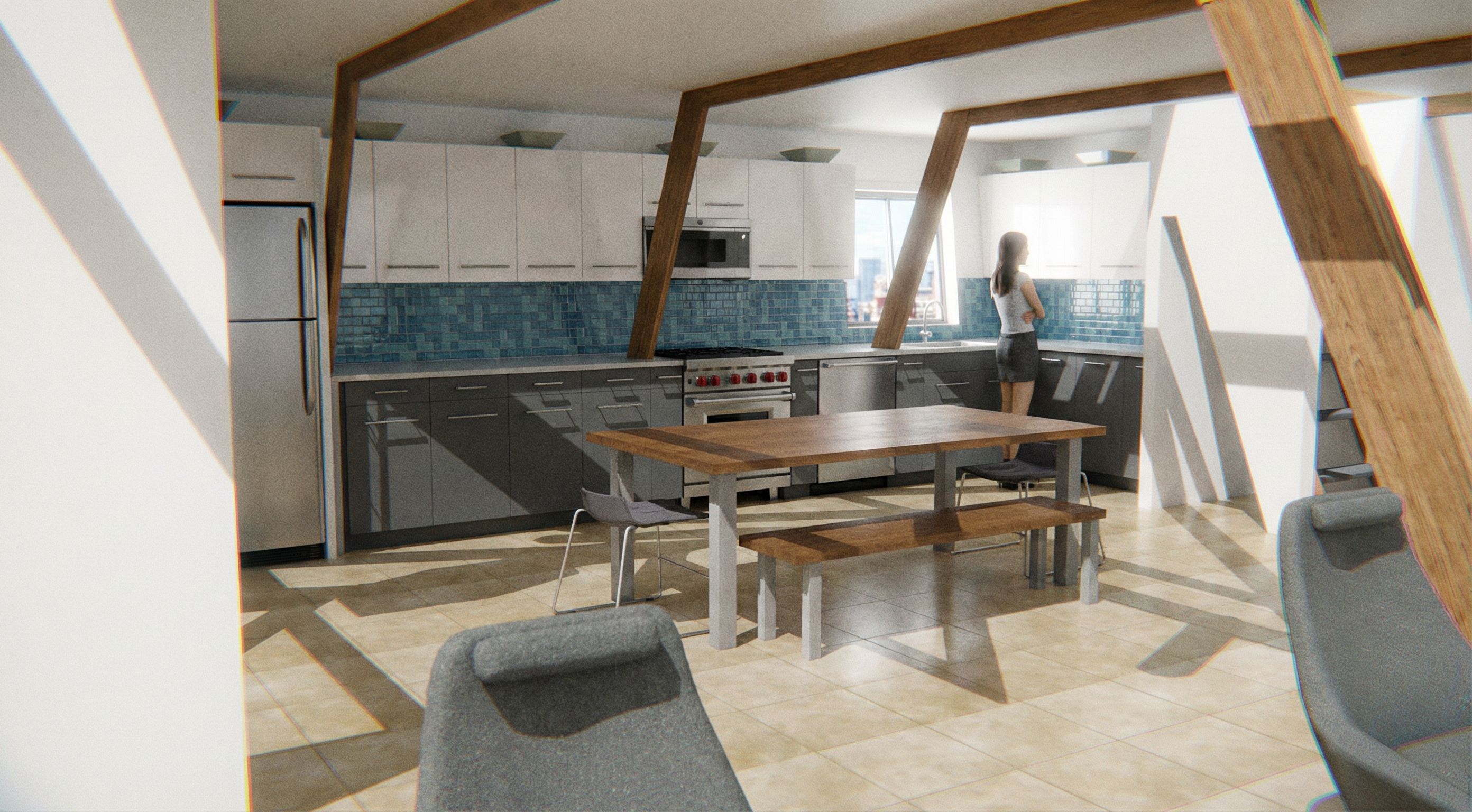 Photo of a modern kitchen interior featuring a minimalist design with sleek cabinetry, metallic appliances, and a wooden dining table. The architecture highlights geometric lines and natural wood beams, creating an open-air feel. Set in a bright urban environment with large windows allowing ample natural light, casting soft shadows across the tiled floor. Captured from a slightly elevated angle with a wide lens to showcase the spacious layout and design elements, enhancing the lifelike qualities of materials and textures in the scene. anywhere and ADD the CEILING. NO skylights. Please follow the directions of the wood beams. one window above the sink.