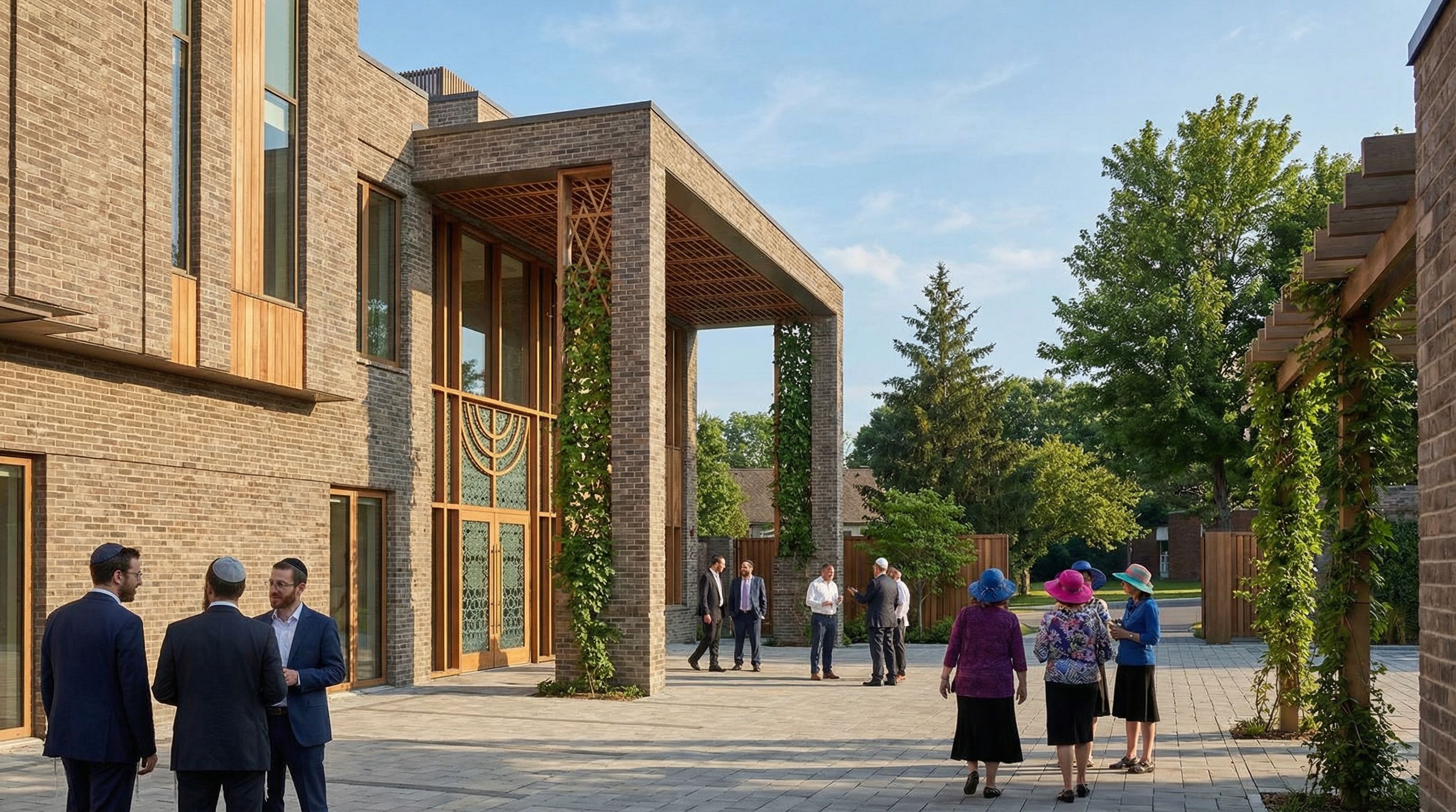architectural exterior rendering, render this 3D mass into photorealistic rendering, Photo of a modern synagogue building featuring a blend of textured brick and warm wood accents. Emphasize the intricate facade details, including large windows that enhance natural lighting, and a striking patterned entrance door. afternoon sunlight casts soft shadows, highlighting the architectural lines. keep Perspective, group of men with kippa and women with colourful hats, greenery on column trellis, , eye level view, including people, high quality, professional, detailed scene