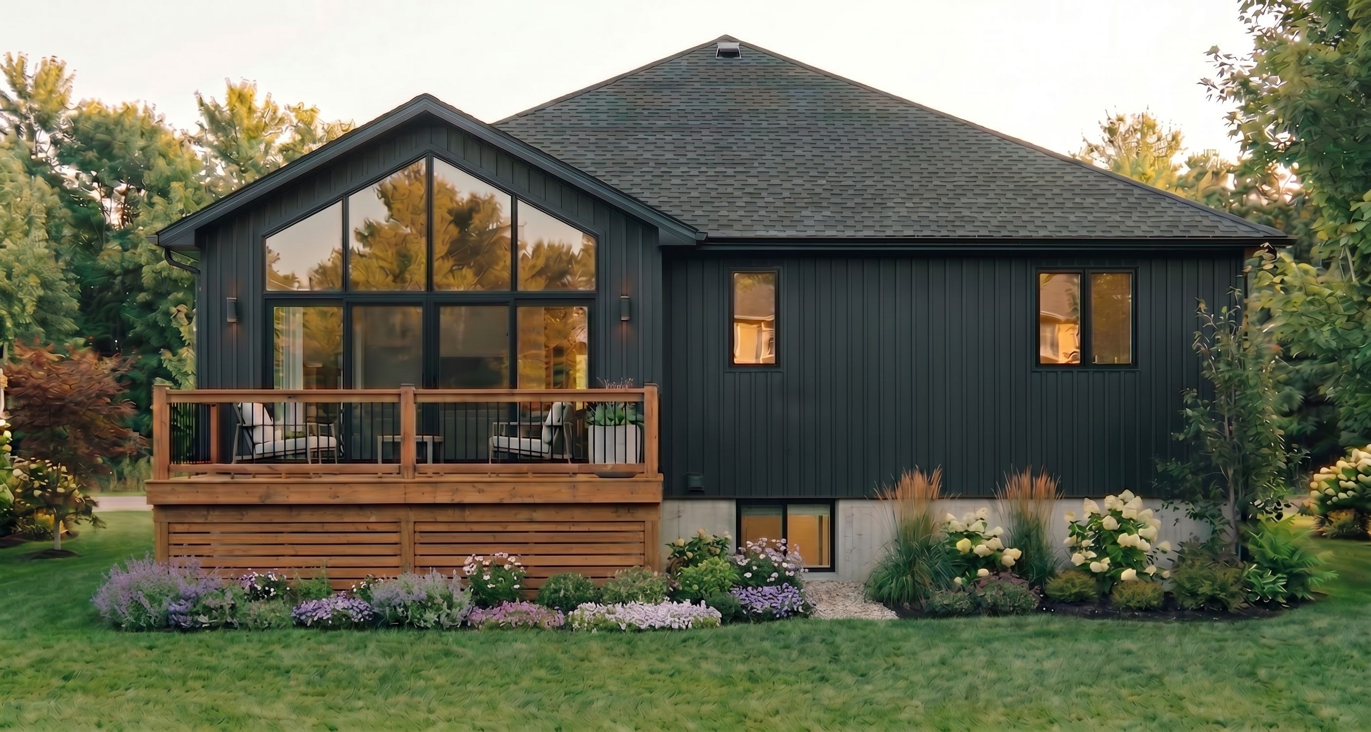 PromptAdd some deck skirting and flowers infront, leave the windows area clear, keep exact camera angle