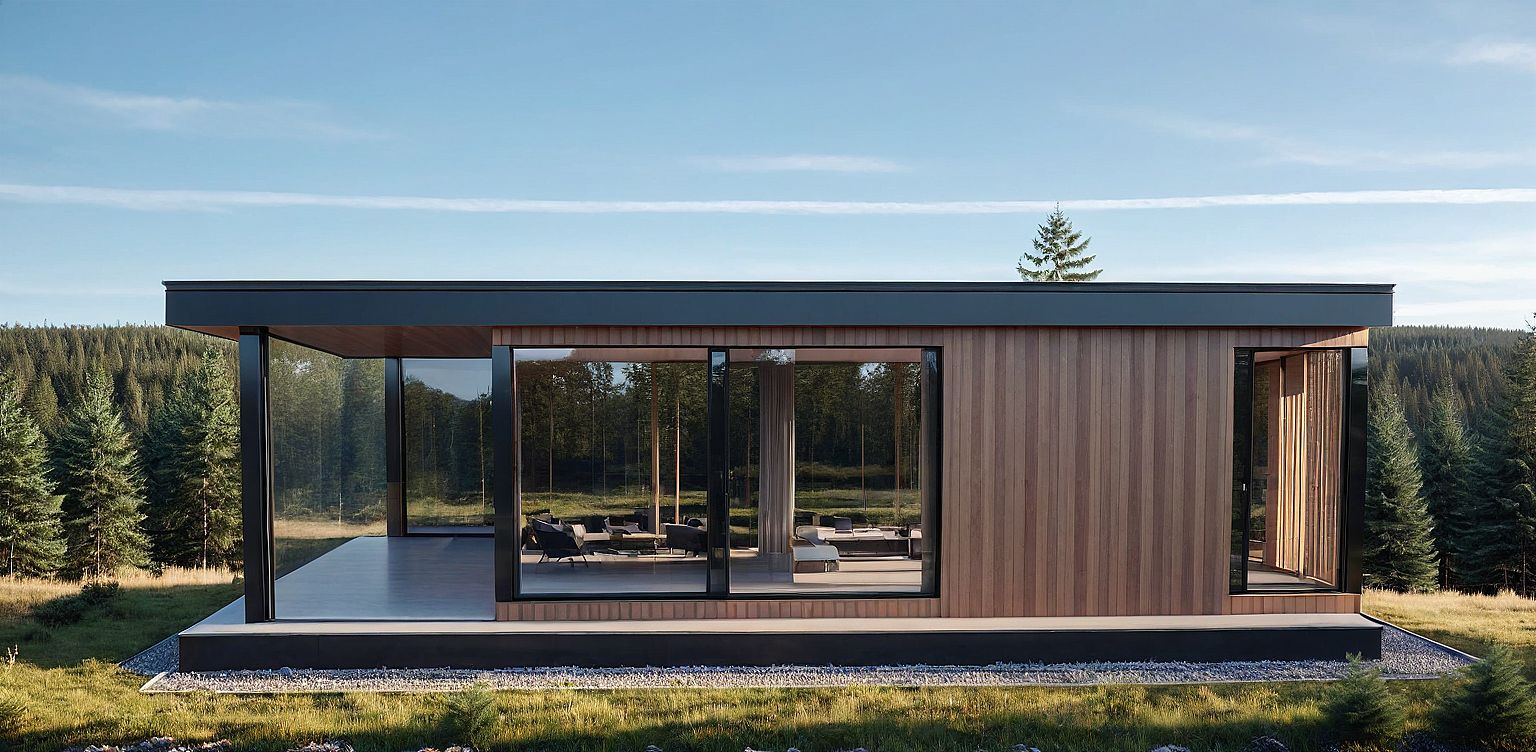 Promptmodern high-tech house with panoramic windows and with an outdoor terrace. Against the background of a coniferous forest.