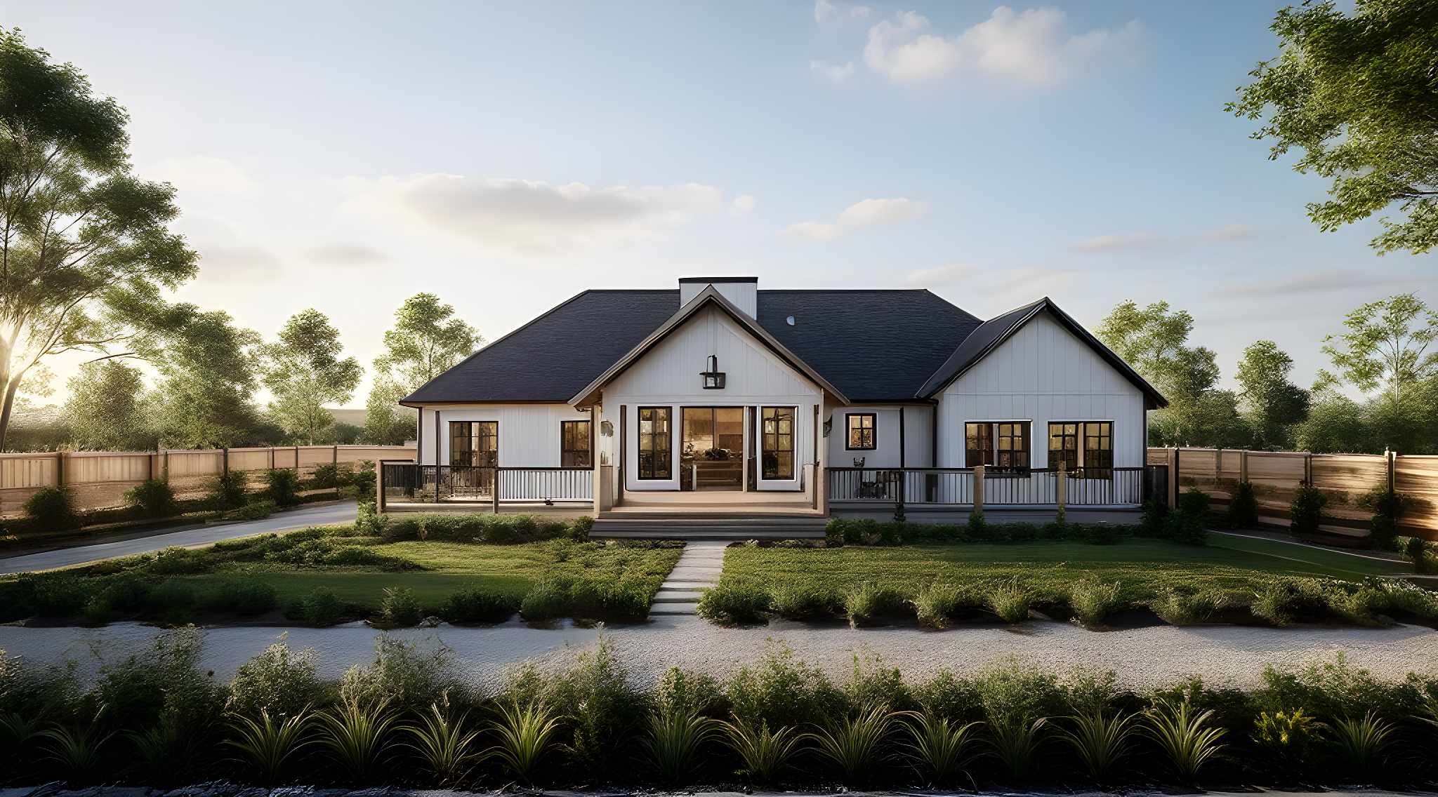 Promptdetailed photo backyard of home in farmhouse design with bright daylight