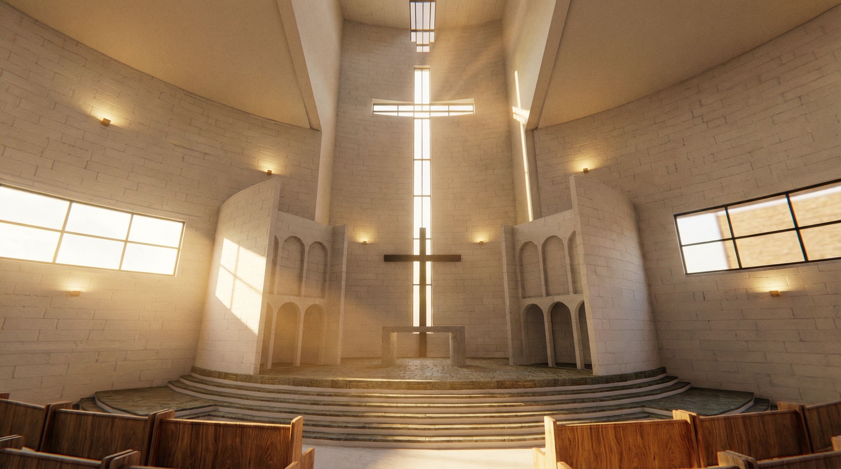 this is a scene of a church from the inside.. i want you to enhance the material and change into painted off white and make it more realistic and the wood of the chairs must look real and new and enhance the lighting of the sun and edit the modelling problems without changing the design take the reference to know how the lighting is set don't add artificial lights or linear lights... just the sun rays... , keep exact camera angle