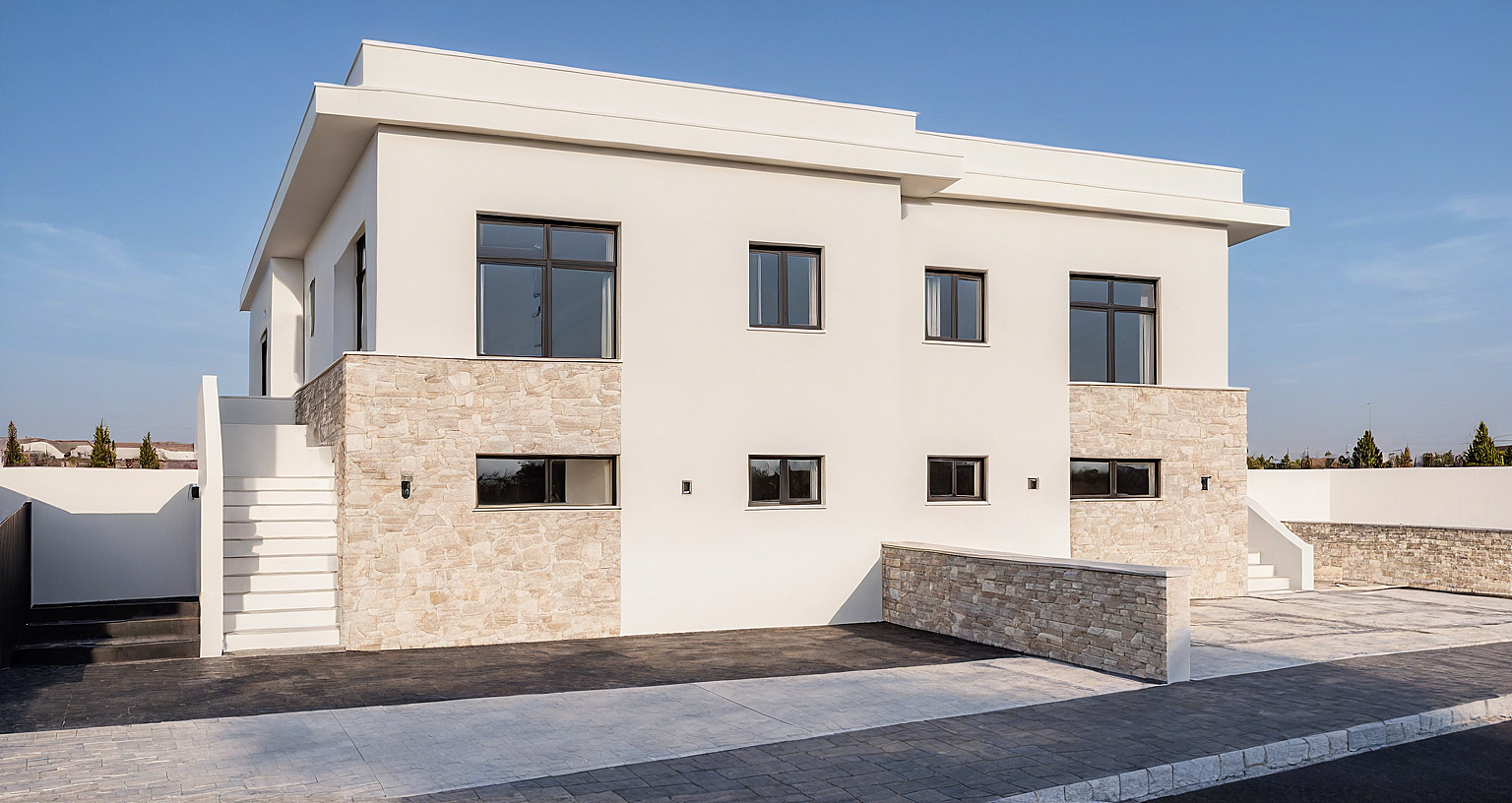 Modern Design, natural stone, suburbs neighborhood , keep same materials as the input image, white is plaster, light stone paving in front parking