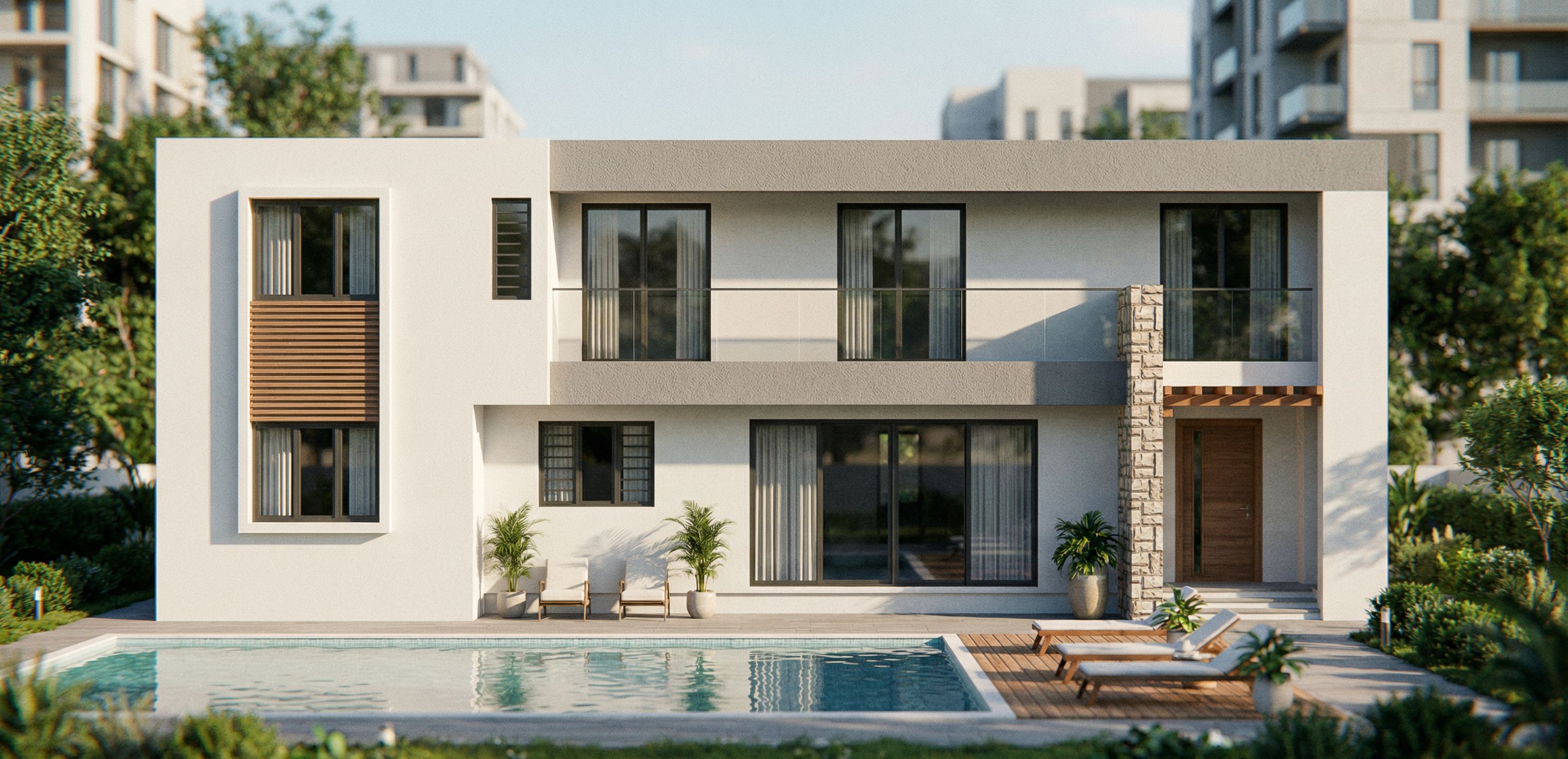 PromptPhoto of a modern residential building featuring a minimalist design, with smooth, white l walls. The architectural elements include large, rectangular windows and horizontal slats for shading, complemented by a stone-textured facade at the entrance. a pool and decking infornt the terrace . Set in an urban environment, surrounded by greenery and contemporary structures. Soft afternoon sunlight casts gentle shadows, highlighting the textures. Captured from a slightly elevated front angle to emphasize the clean lines and spacious balcony, using a standard lens for a balanced depth of field., keep exact camera angle