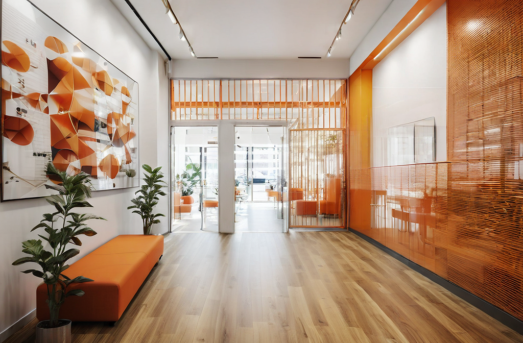 PromptThis is a reception area with a bright orange bench and a security room glass on the right. Keep the art on the left wall. Keep all elements and colours. Wooden vinyl floor.