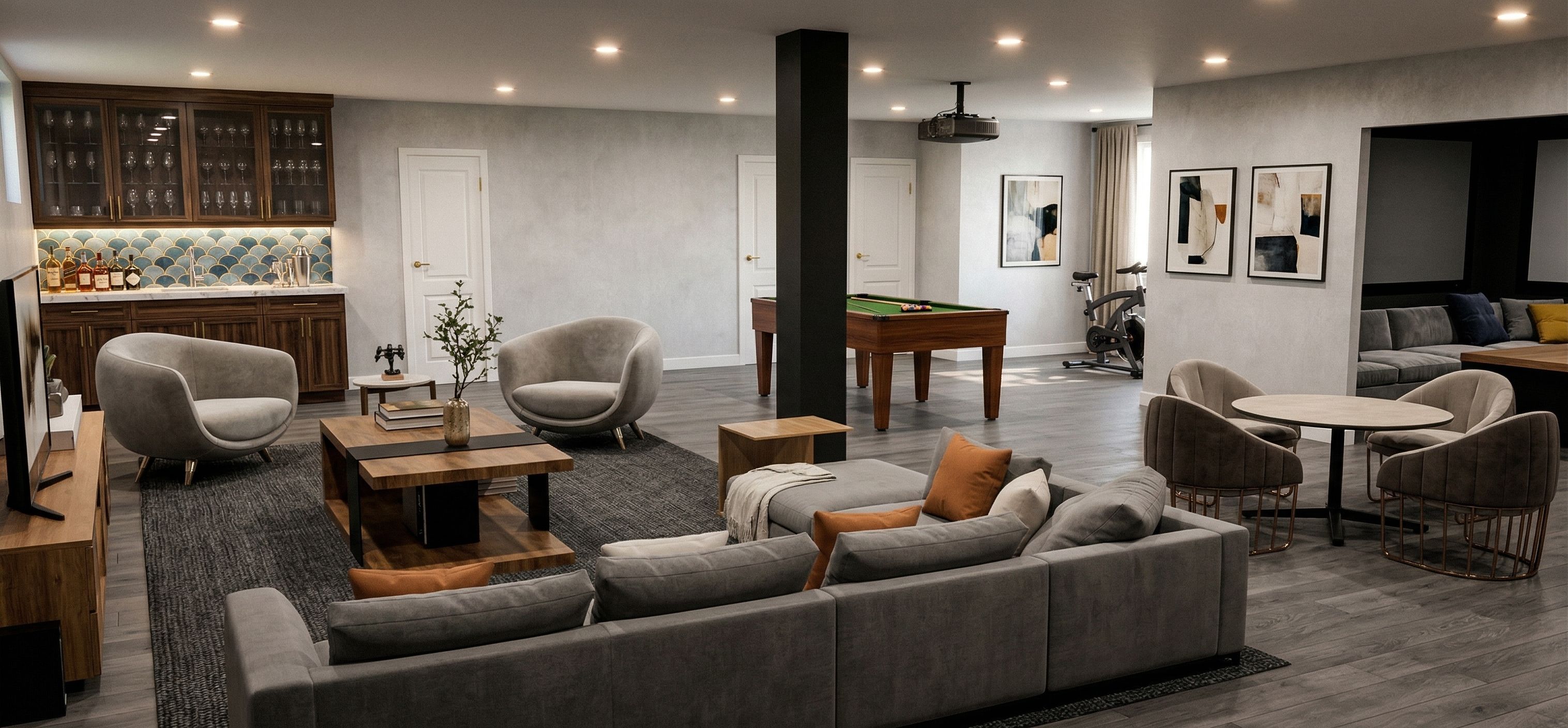 A photo of a fun basement rec room, a moody theatre area, projector and screen, cozy furniture, a table and chair set, custom bar area with booze on display, glass door upper cabinets, wine glasses, marble counters, fun back splash, dark wood cabinets, grey wood flooring, curtains and art work on either side of the window, pot lights in the ceiling, under cabinet lights, keep exact camera angle, keep exact camera angle
