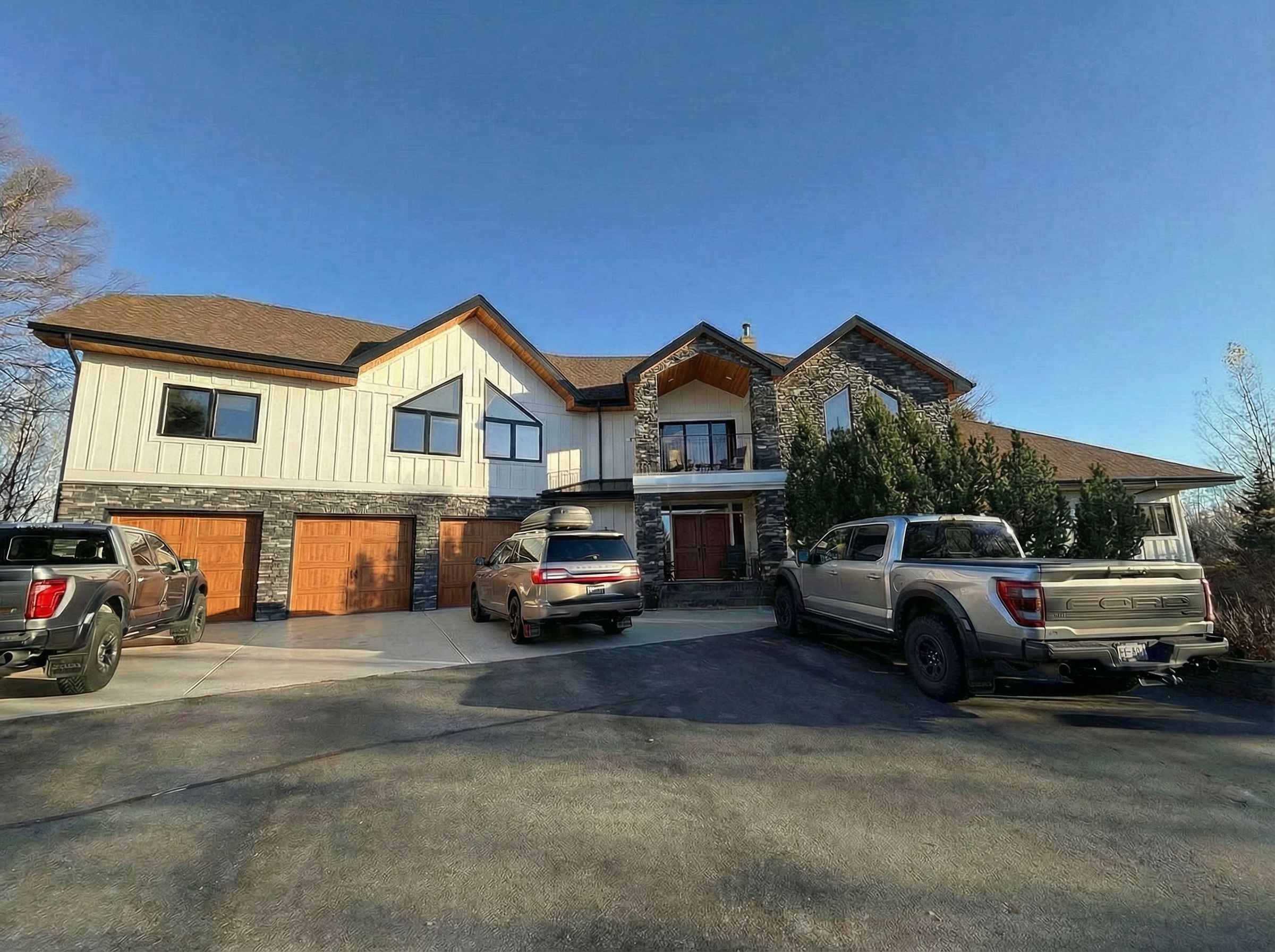 Promptarchitectural exterior rendering, render this 3D mass into photorealistic rendering, make the three garage doors square not arched. make the roof trim black with wood tone sofits. do not change anything else, keep exact camera angle, high quality, professional, detailed scene