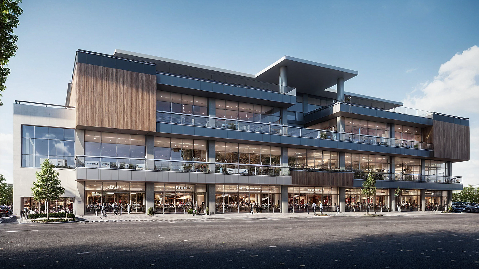 Promptshopping mall, cars, trees, people, realistic rendering, modern facade, realistic sky, parked cars, lighting on the facade, small trees in front of the building, people walking, cars passing by