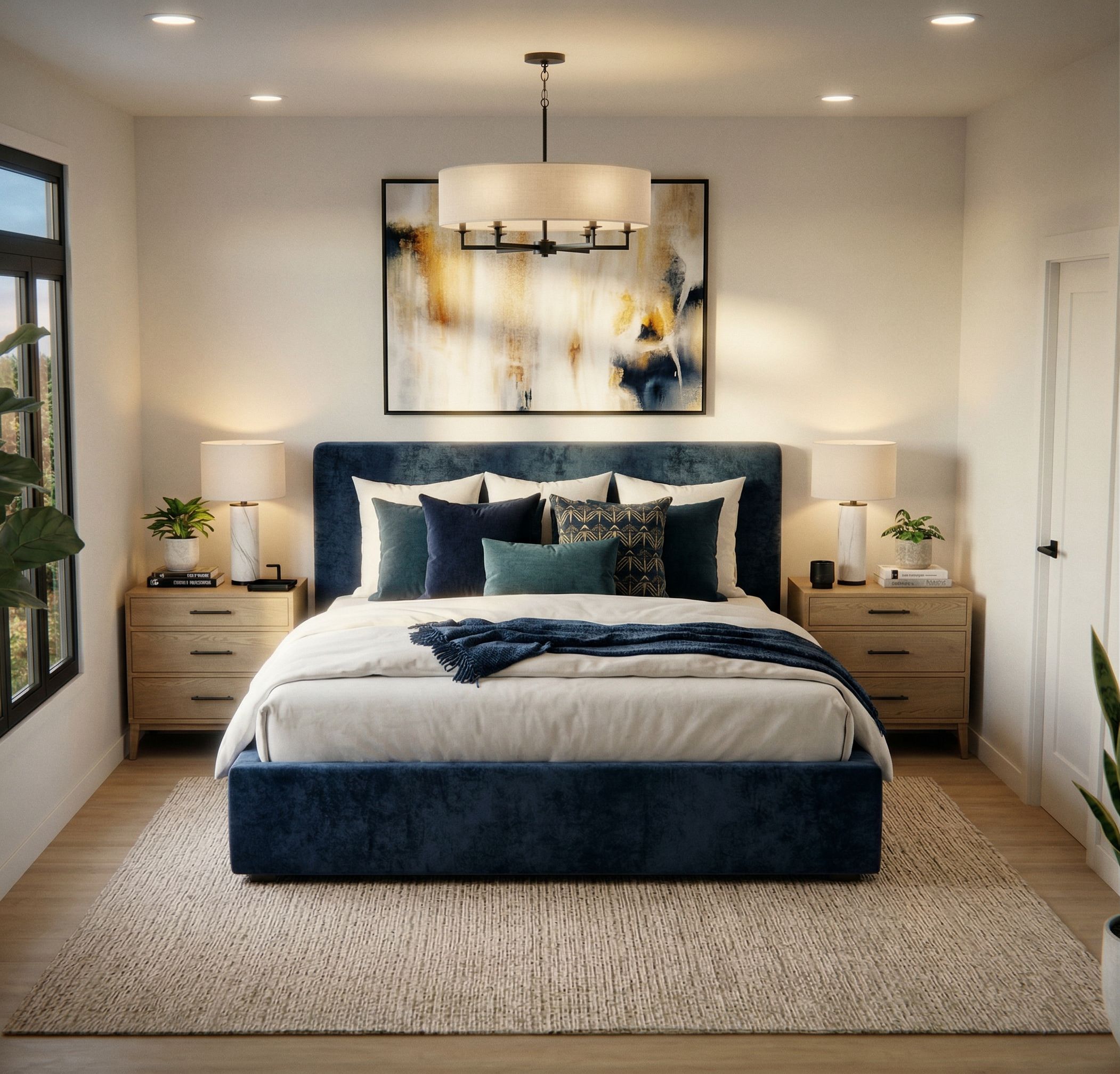 Promptshow me a different bed, add dark blues and black fixtures/accents , keep exact camera angle