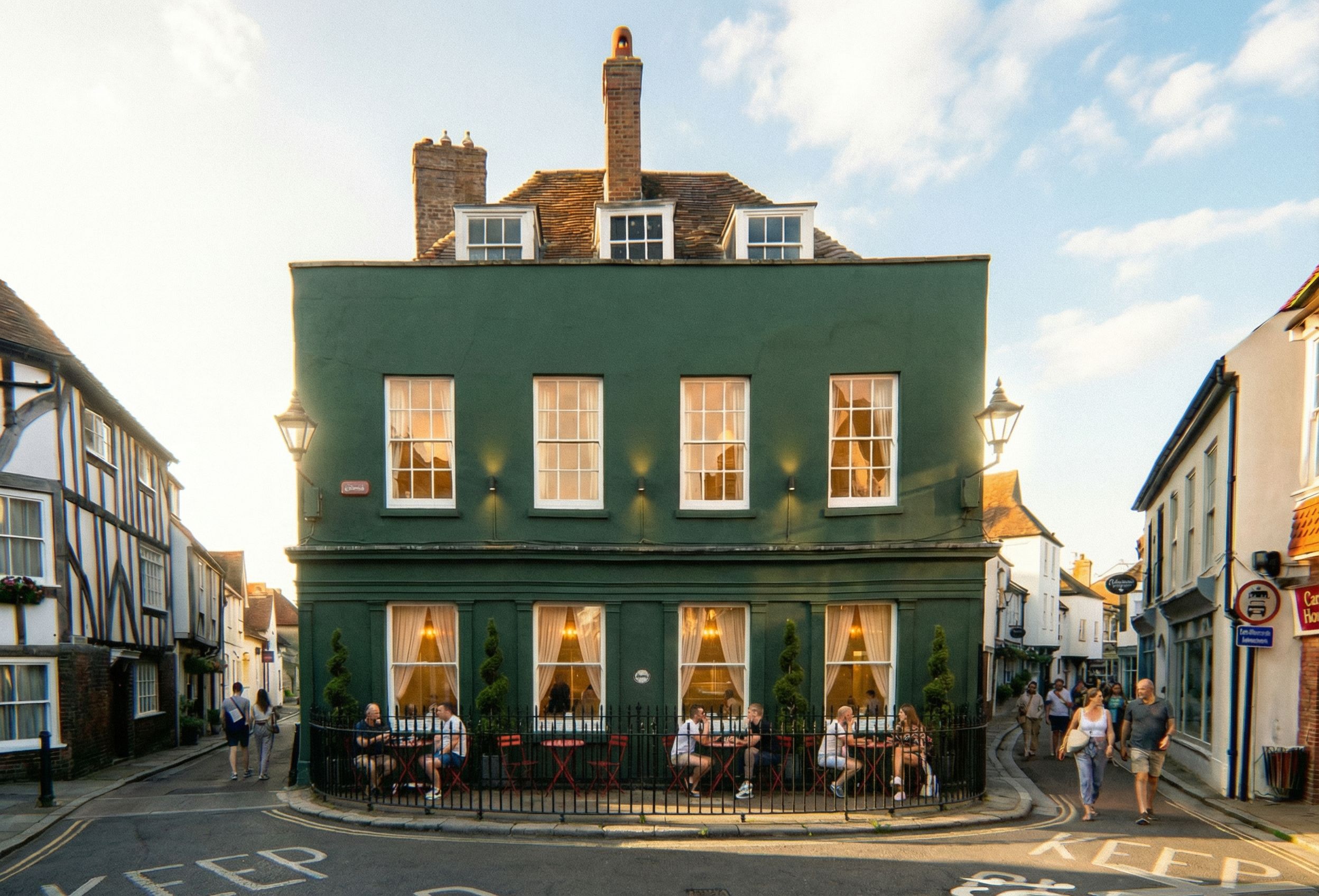 move metal railing in front of tables and chairs following curved curb line, sunny day, nice sky, remove imperfections on walls, brighten sunlight, keep exact camera angle