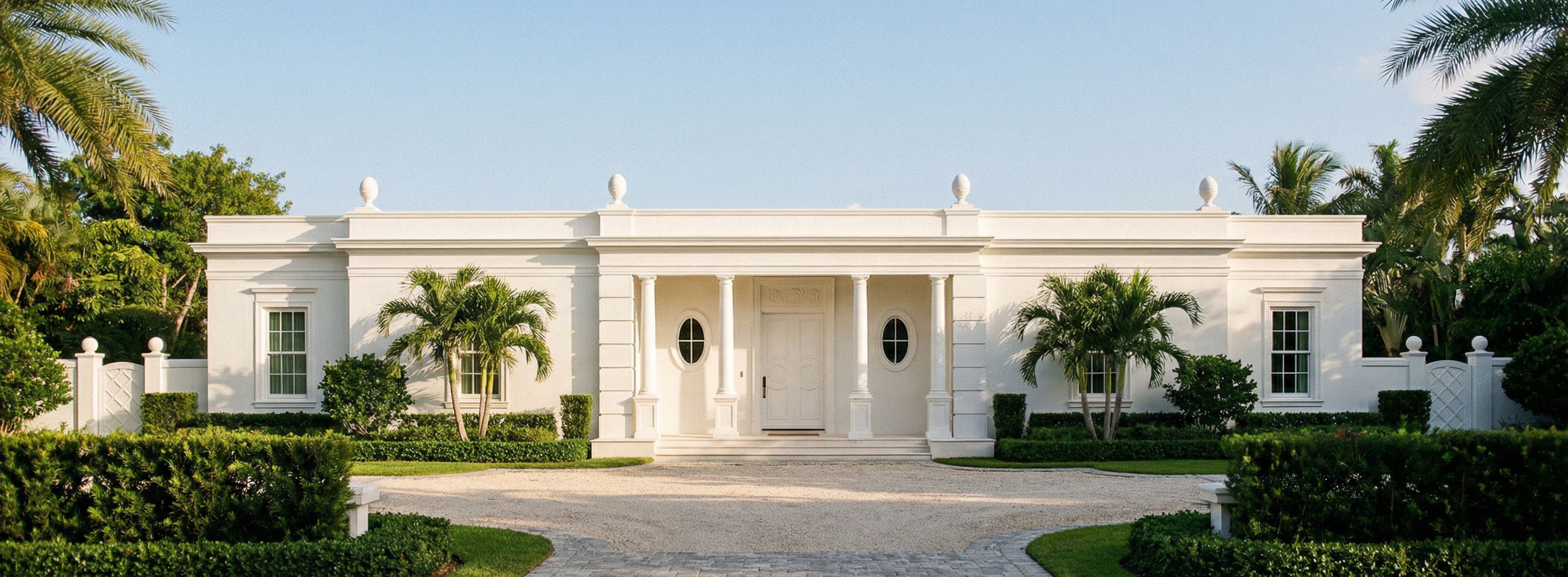 Palm Beach landscape: symmetrical, restrained, luxurious. Curved motor court